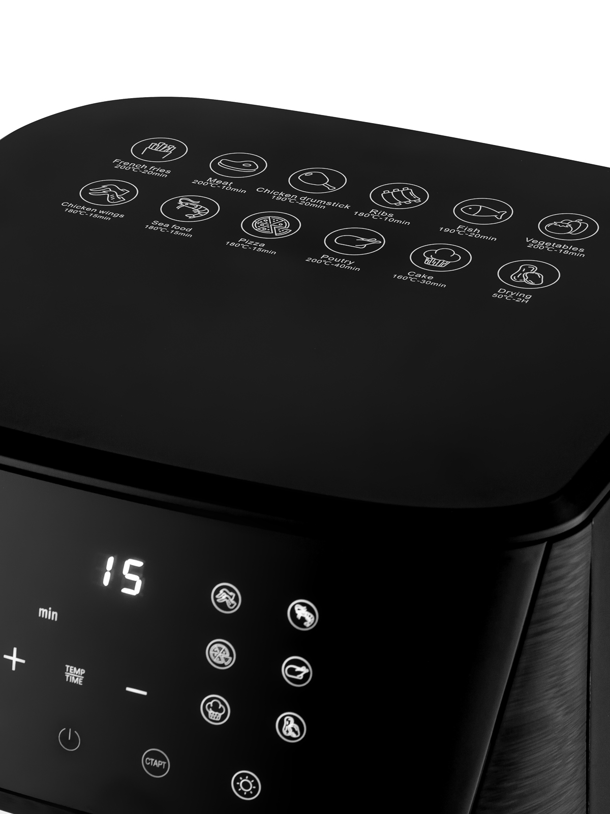 12 программ: фри, мясо, голень, ребра, рыба, овощи, морепродукты, крылья, птица, пицца, сушка, кекс