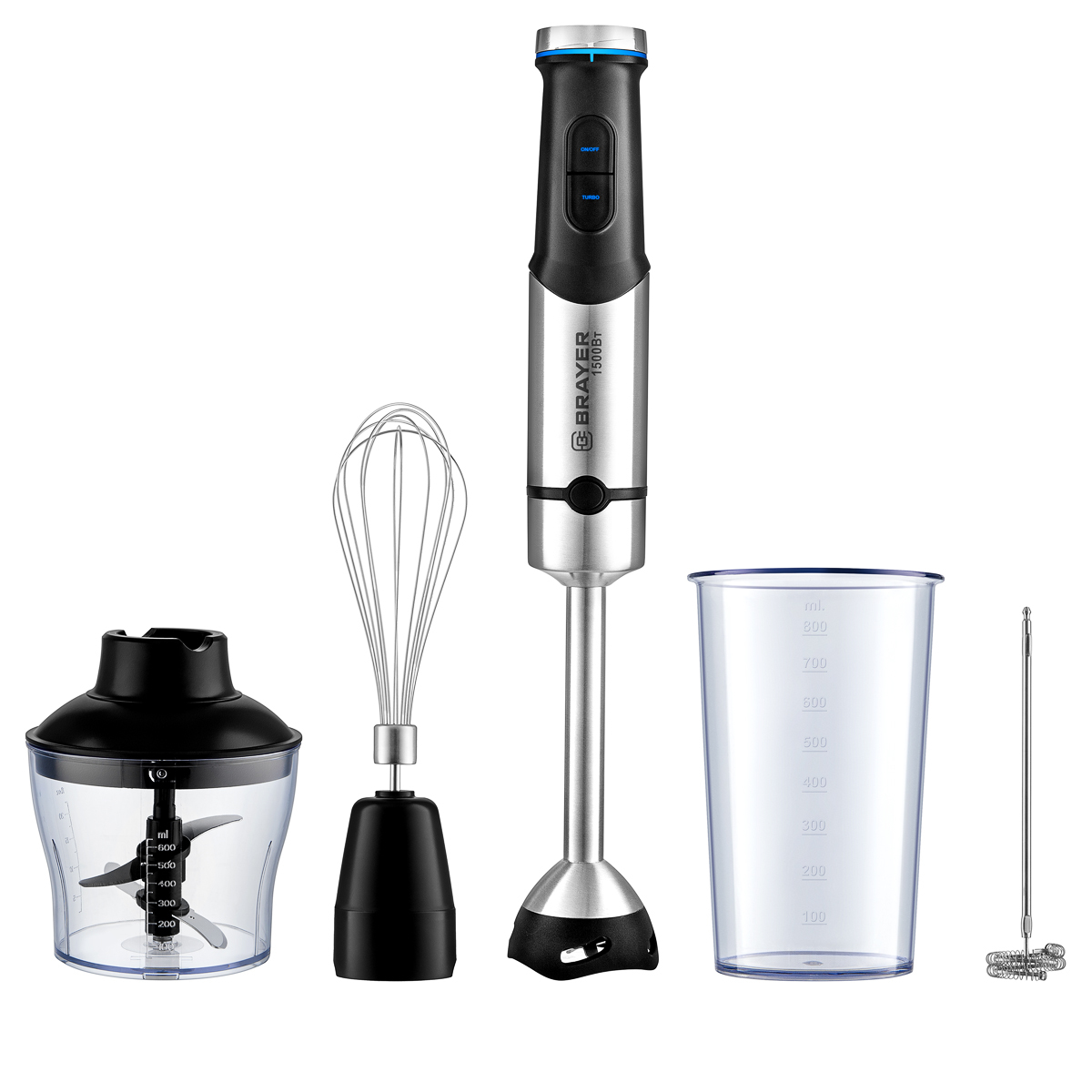1500Вт, лезвия титан, погружная часть нерж.сталь, турборежим, плавная регулир. скорости, венчик, стакан 800мл, измельчитель 600мл, капучинатор