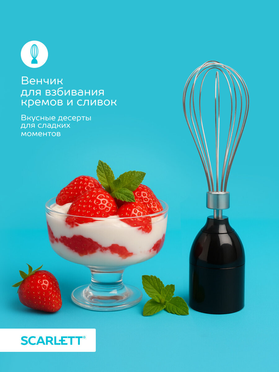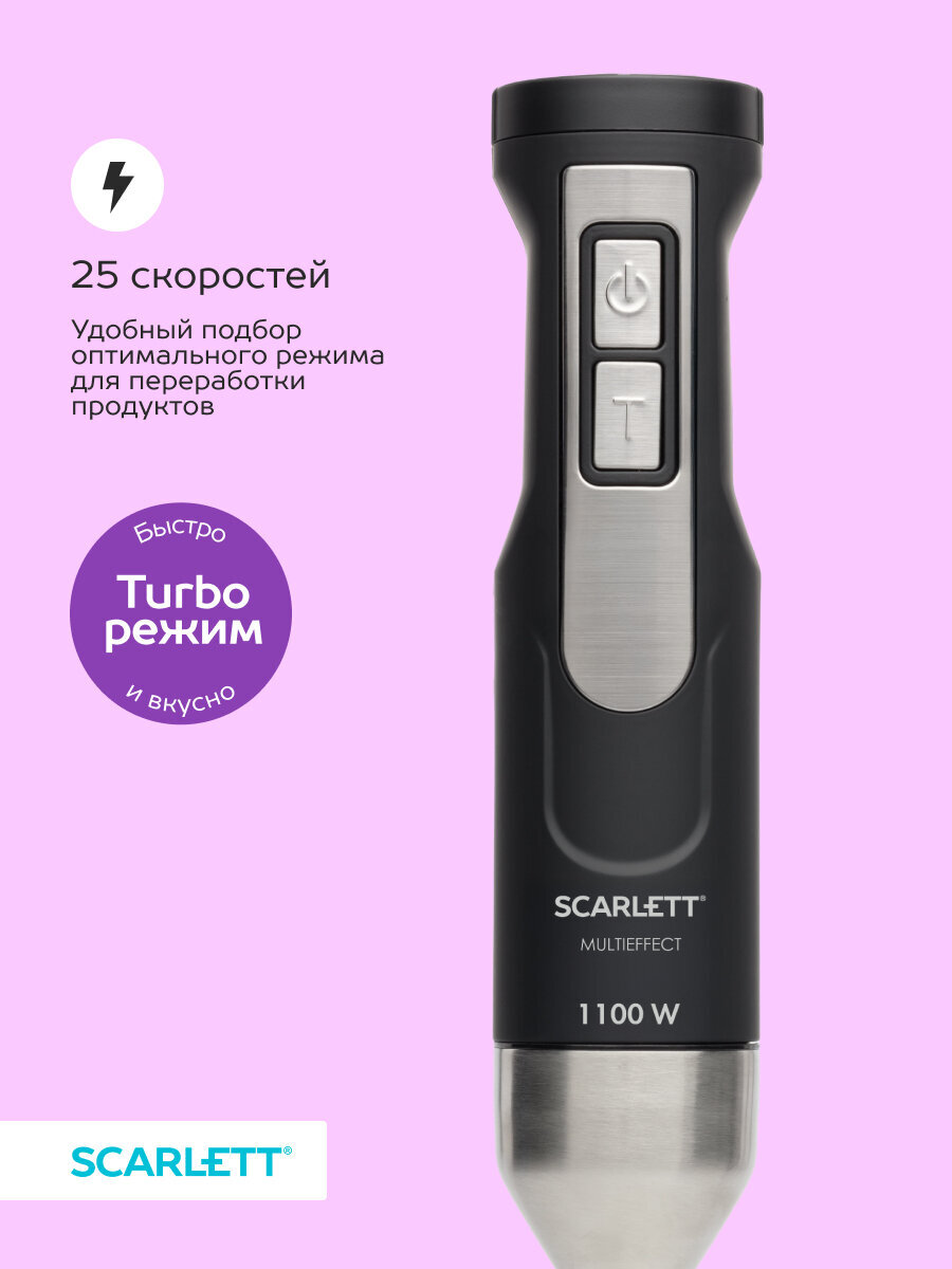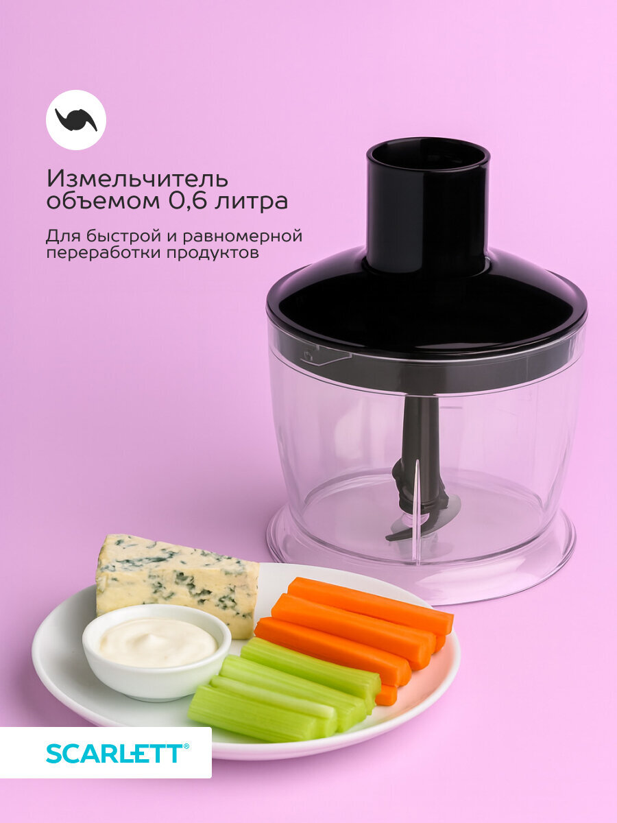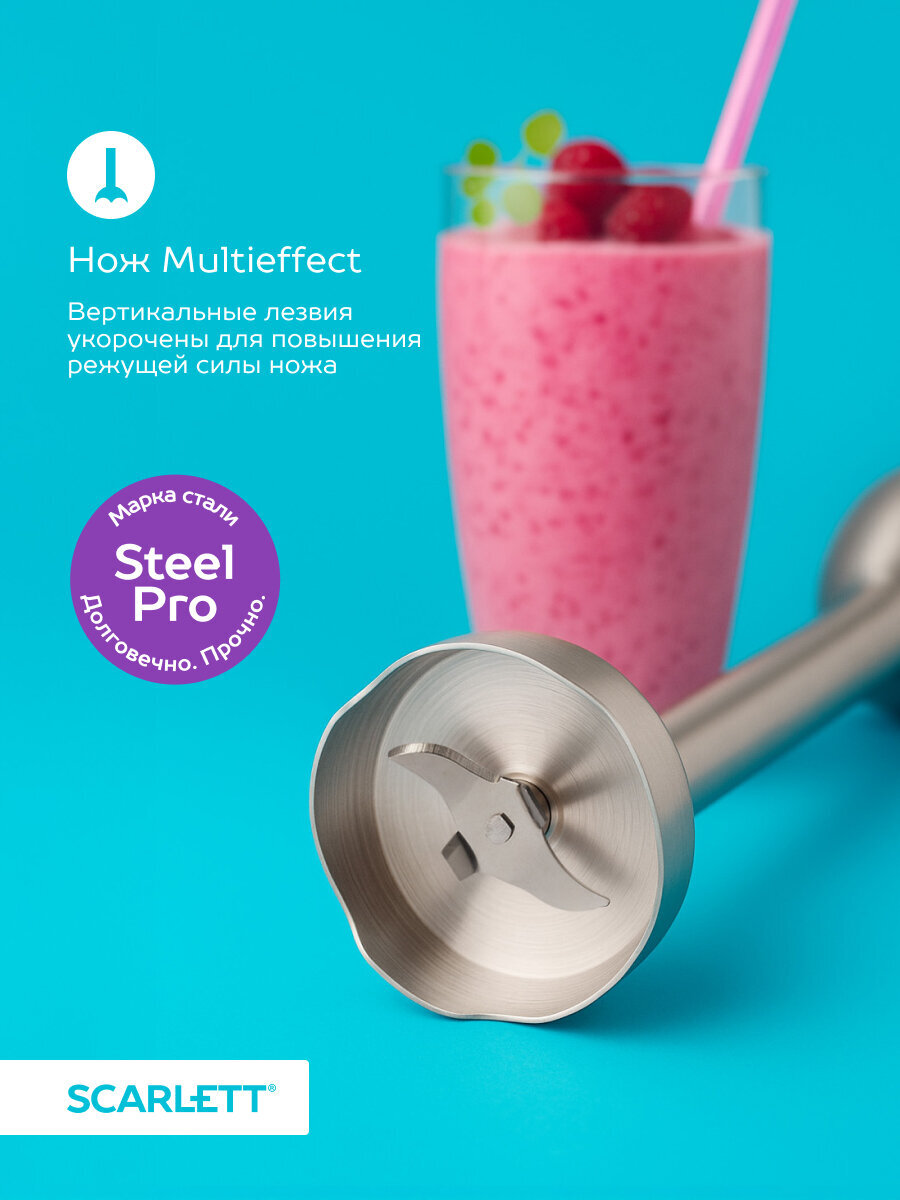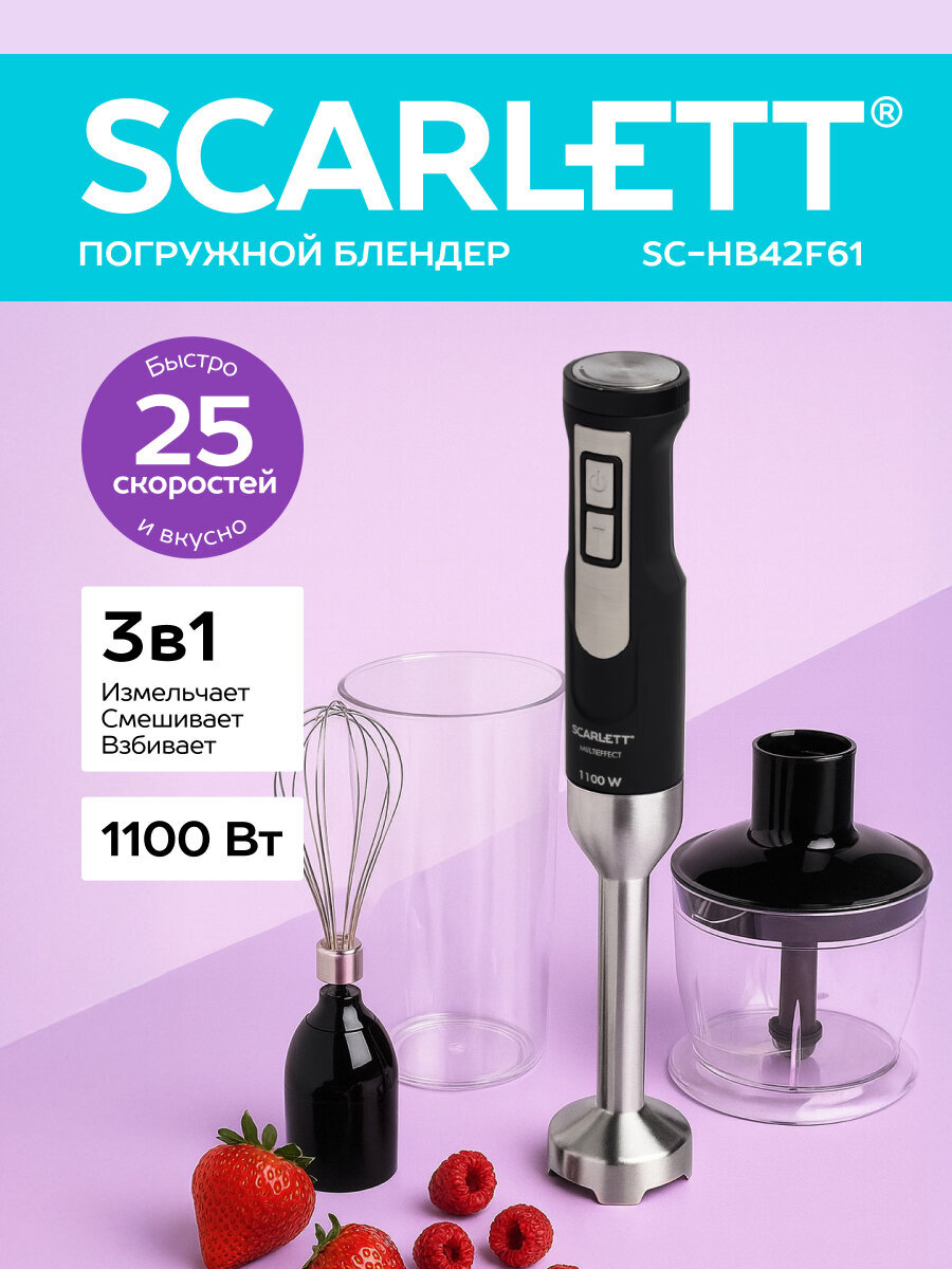 Погружной блендер Scarlett SC-HB42F61 оснащён мощным мотором высокой мощности 1100 Вт, к нему прилагается мини-измельчитель, мерный стакан и венчик, с помощью которых можно измельчать продукты, готовить тесто, взбивать крем, выполнять другие задачи. Цельнометаллическая погружная часть блендера изготовлена из прочной нержавеющей стали собственной марки Steel Pro, а благодаря эргономичной форме корпуса прибор будет особенно хорошо лежать в ладони. Выберите одну из двадцати пяти скоростей простым поворотом переключателя. Начинайте с низкой скорости, чтобы избежать брызг и используйте режим Turbo в конце использования для получения идеального результата.