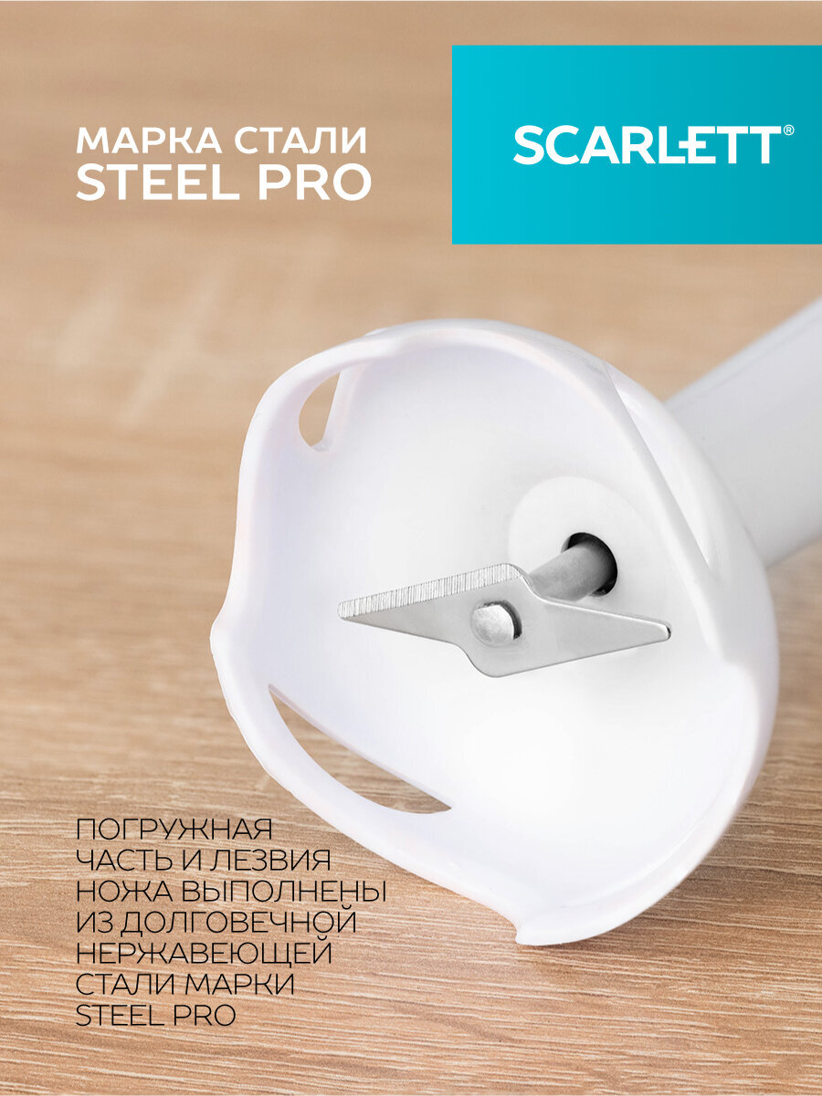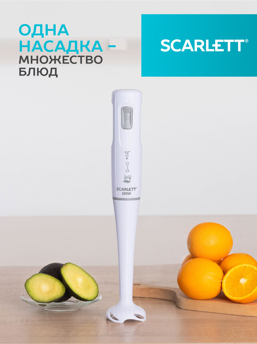 Погружной блендер Scarlett SC-HB42S12 – универсальное устройство, выполненное в классическом белом дизайне, дополненном серой кнопкой.