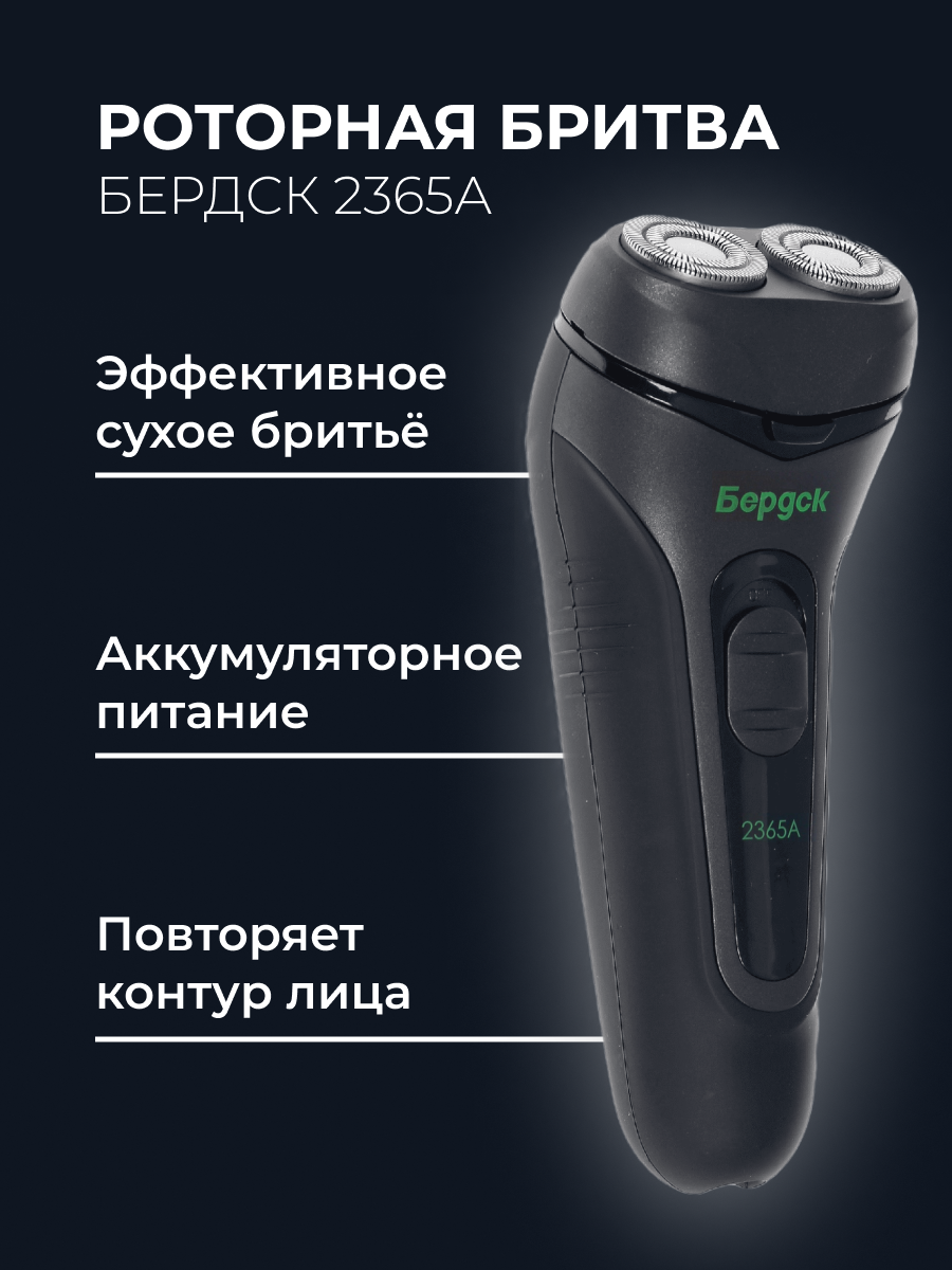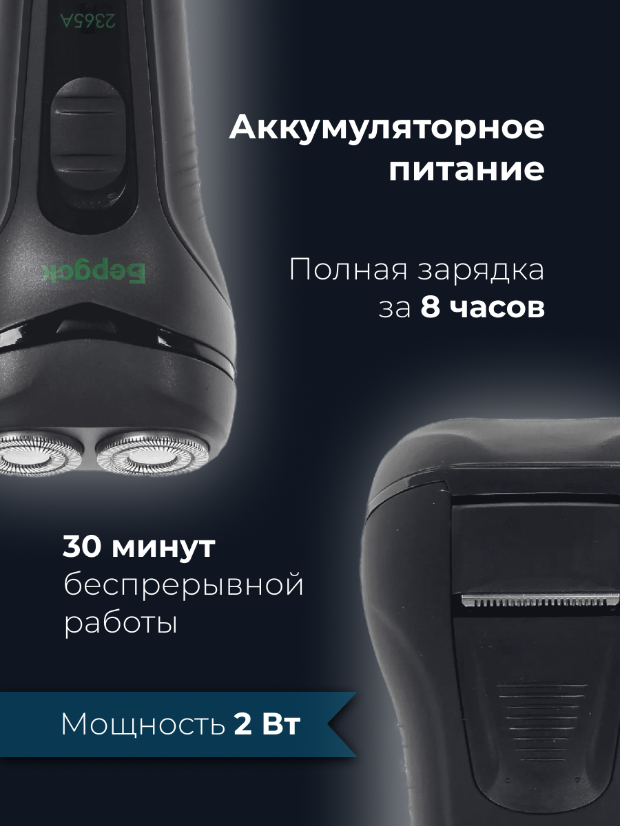 акк, акк.питание 2.4W, номинальная потребляемая мощность 2W, роторная, 2 бреющих головки, триммер для бороды и усов, сухое бритье, время работы 30мин, время зарядки 8ч