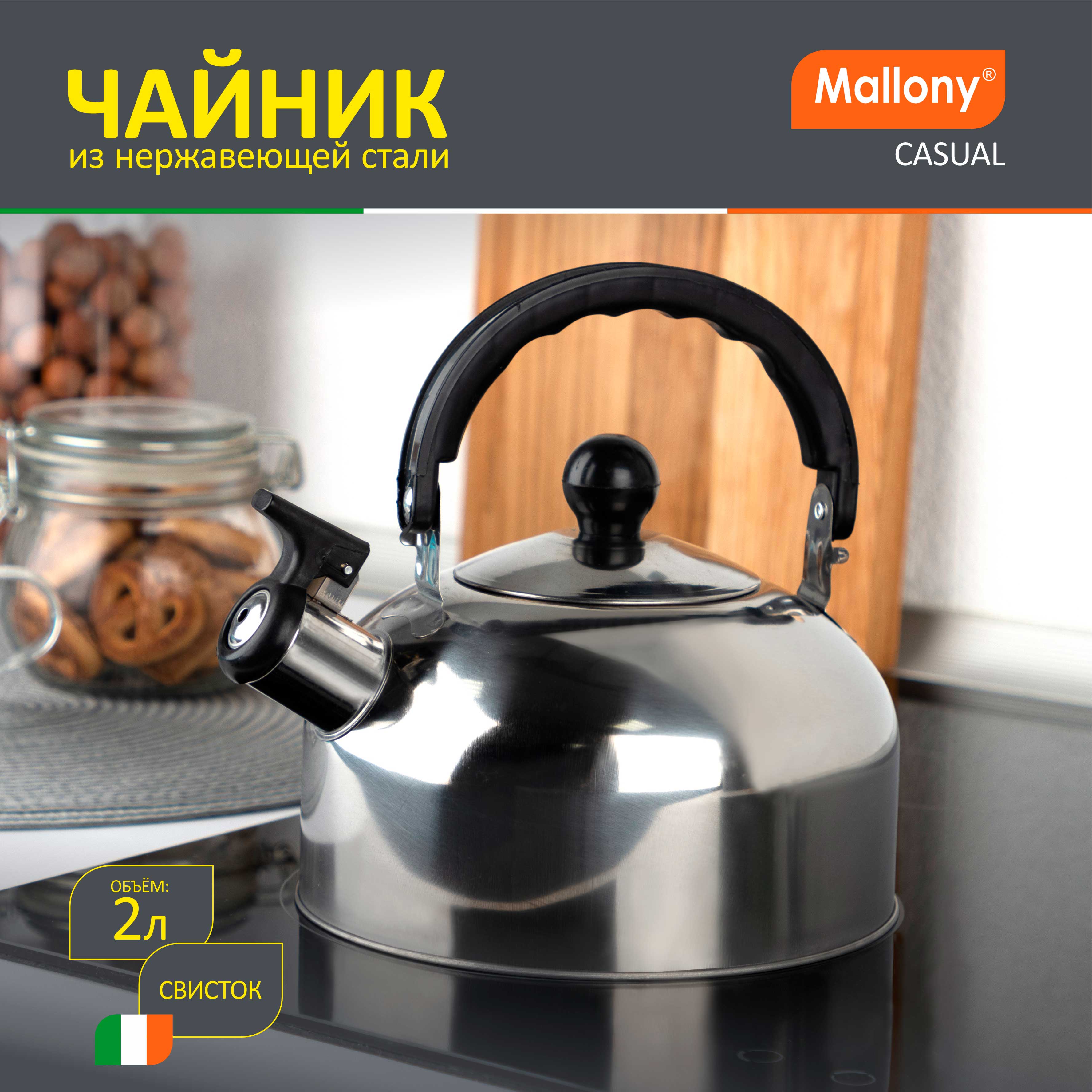 Чайник из нерж стали со свистком Casual, зеркальная полировка, литраж - 2 л, без тм Толщина стали - 0,25 мм Материалы - нерж сталь, пластик. Дно - однослойное. Подходит для всех типов плит.