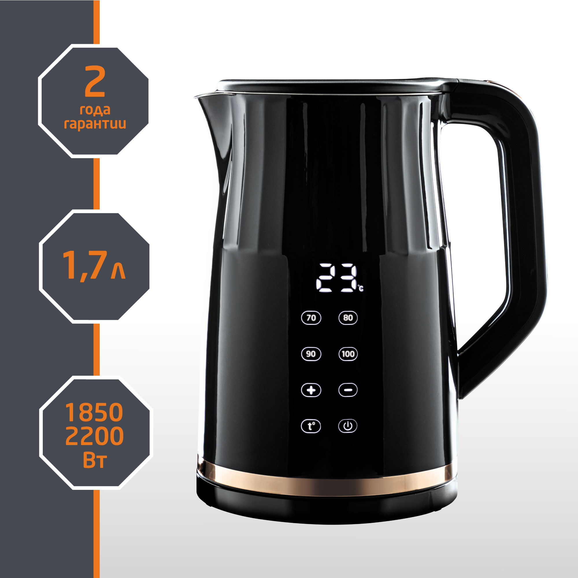 Мощность 1850-2200 Вт Объем 1.7л Двойной корпус Поворот на подставке 360° Защита от работы без воды Автоматический выключатель Сенсорная панель управления на корпусе Дисплей на корпусе Регулировка температуры подогрева воды от 40℃ до 100℃, шаг 5℃ 4 температурных режима подогрева воды 70℃,80℃,90℃,100℃ 2 часа поддержание температуры функция памяти Контроллер OTTER (Англия) Цвет черный Размер 21,1*18,1*25,2 Гарантия 2 года Длина шнура 74 см