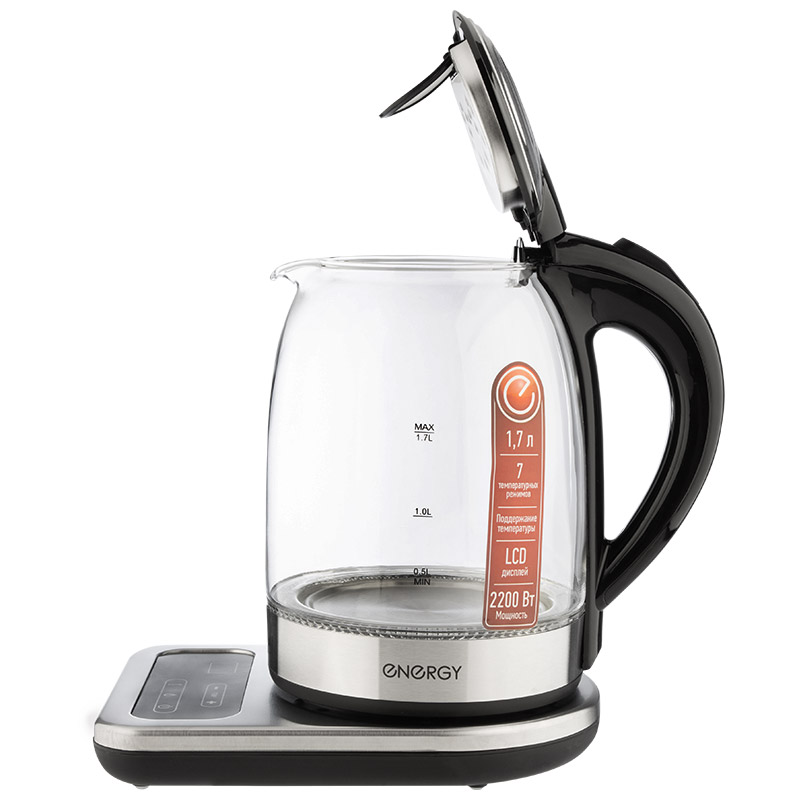 Объем 1.7 л Корпус из термостойкого стекла Шкала уровня воды Внутренняя подсветка Сенсорное управление LED дисплей на подставке поддержание температуры Установка температуры нагрева: 40℃, 50℃, 60℃, 70℃, 80℃, 90℃, 100℃ Закрытый нагревательный элемент из нержавеющей стали Поворот на подставке 360° Защита от работы без воды Автоматический выключатель Мощность: 2200 Вт Длина шнура 72 см