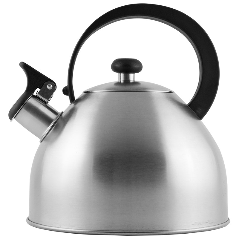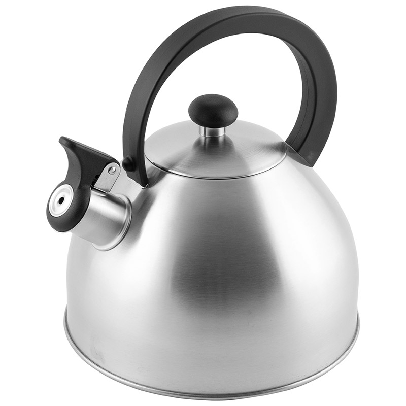 Чайник из нержавеющей стали со свистком с крышкой, с ручкой из нейлона, матовый внутри/матовый - снаружи, дно - одинарное, подходит для всех типов плит, толщина стали - 0.3-0,35 мм, литраж - 2,5 литра, упаковка - цветная коробка. Модель - "Opera" Материалы - нержавеющая сталь, нейлон. Не рекомендуется мыть в посудомоечной машине.