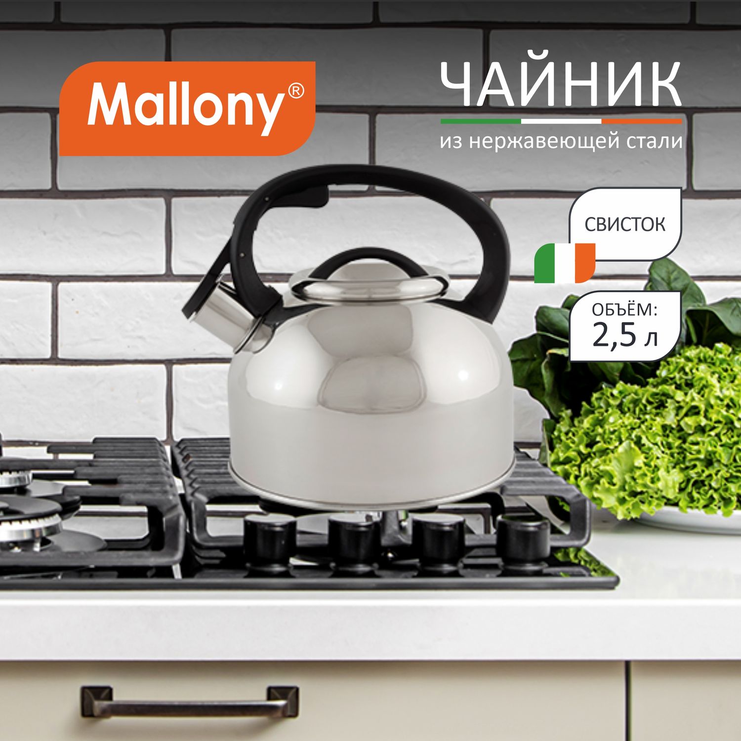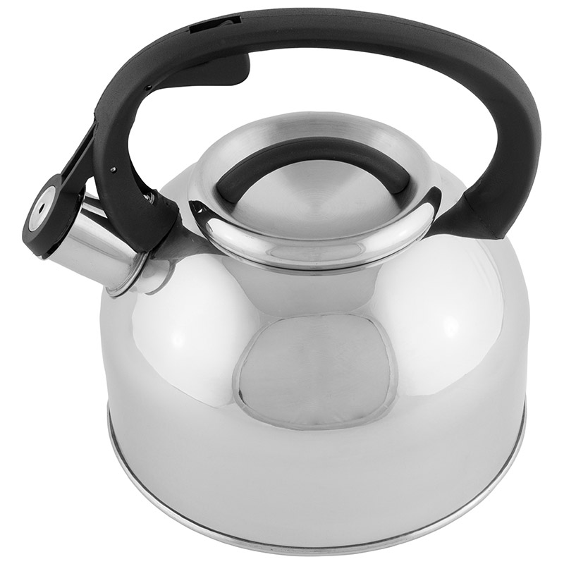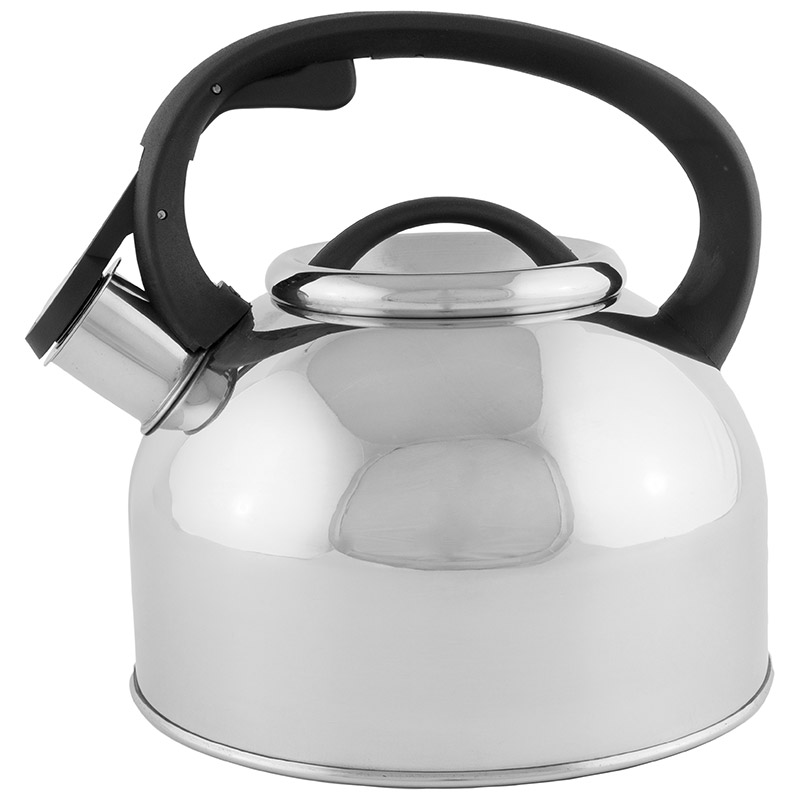 Чайник из нержавеющей стали со свистком, с крышкой, с ручкой из нейлона, матовый внутри/зеркальная полировка снаружи. дно - одинарное, подходит для всех типов плит, толщина стали - 0,3 мм, литраж - 2,5 литра, упаковка - цветная коробка. Название модели - "Arte" Материалы: нержавеющая сталь, нейлон.