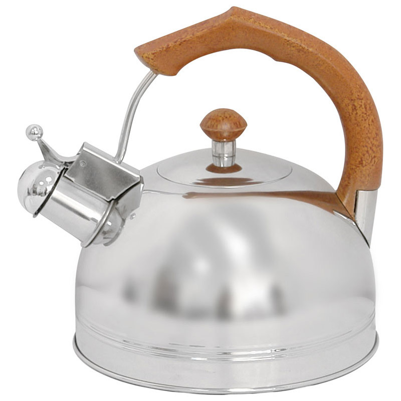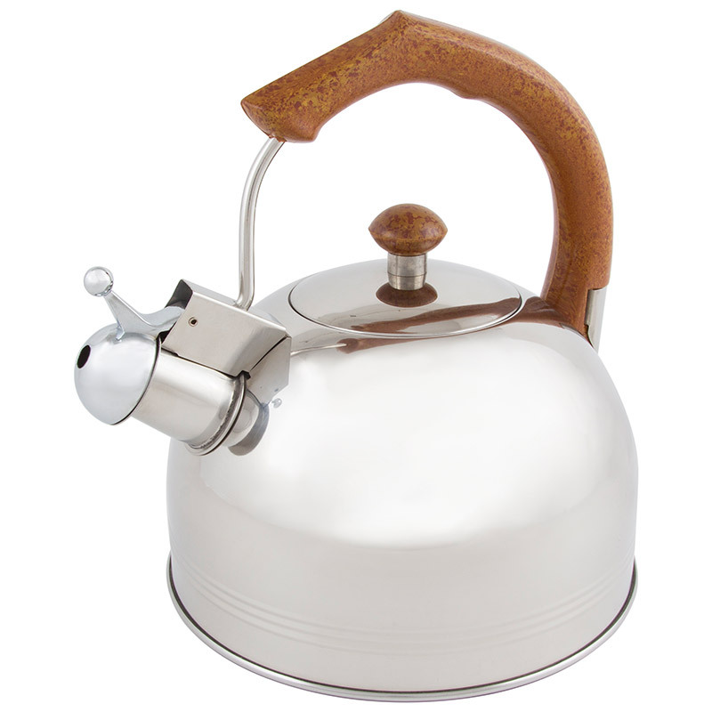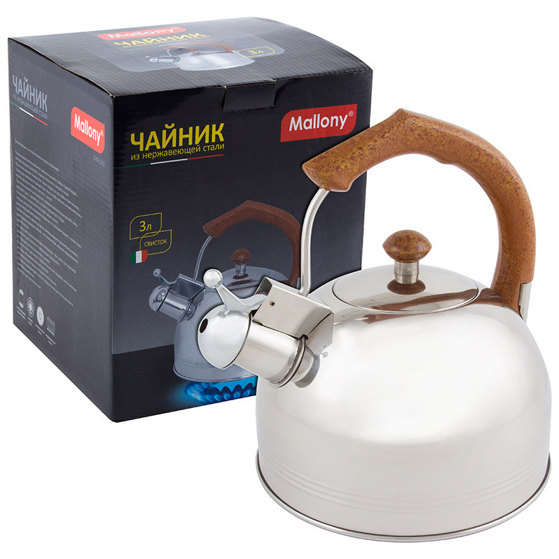 Чайник из нержавеющей стали со свистком. Объем 3,0 литра. Толщина - 0,3 мм. Материалы: нерж сталь, пластик. Капсулированное дно. Зеркальная полировка корпуса. Ручка - пластик. Со свистком Подходит для всех типов плит. Не рекомендуется мыть в посудомоечной машине.