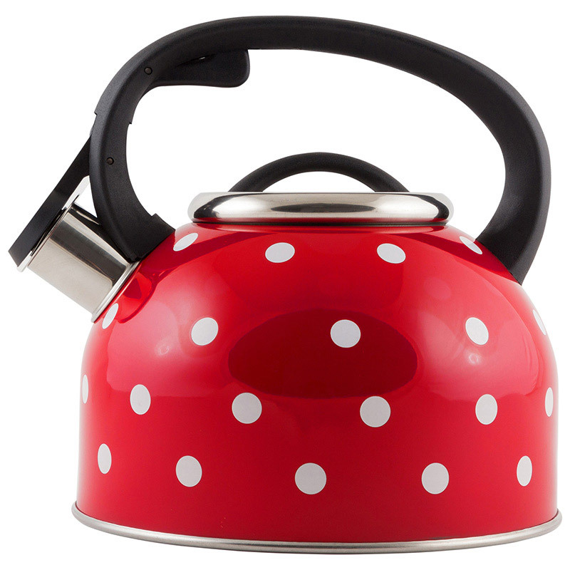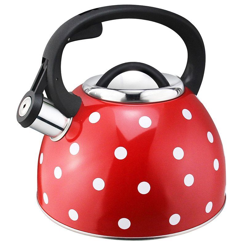 Чайник из нержавеющей стали со свистком с крышкой, с ручкой из нейлона, матовый внутри/окрашенный - снаружи, красный в белый горошек. дно - одинарное, подходит для всех типов плит, толщина стали - 0,3 мм, глянцевая окрашенная поверхность корпуса. литраж - 2,5 литра