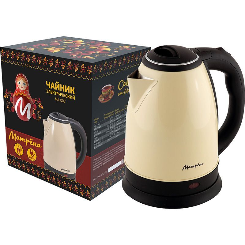 Объем 1,8 л Корпус из нержавеющей стали Закрытый нагревательный элемент из нержавеющей стали Поворот на подставке 360° Защита от работы без воды Автоматический выключатель Световой индикатор работы Место для хранения шнура Мощность 1500 Вт Цвет бежевый Длина шнура 59 см