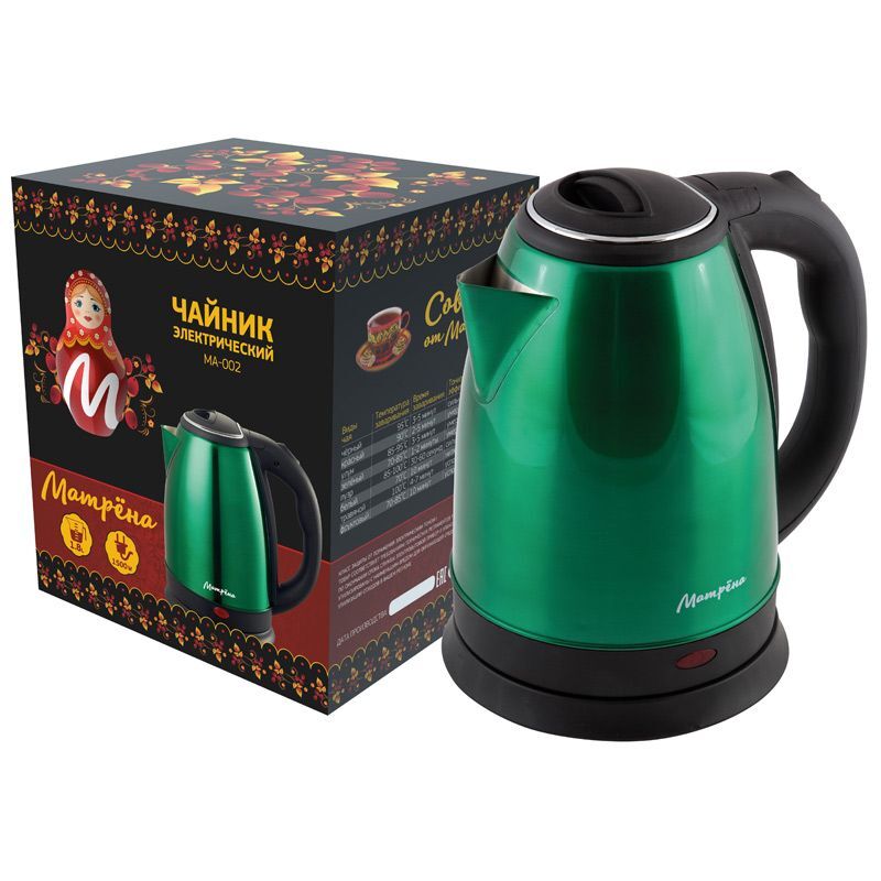 Объем 1,8 л Корпус из нержавеющей стали Закрытый нагревательный элемент из нержавеющей стали Поворот на подставке 360° Защита от работы без воды Автоматический выключатель Световой индикатор работы Место для хранения шнура Мощность 1500 Вт Цвет зелёный Длина шнура 59 см