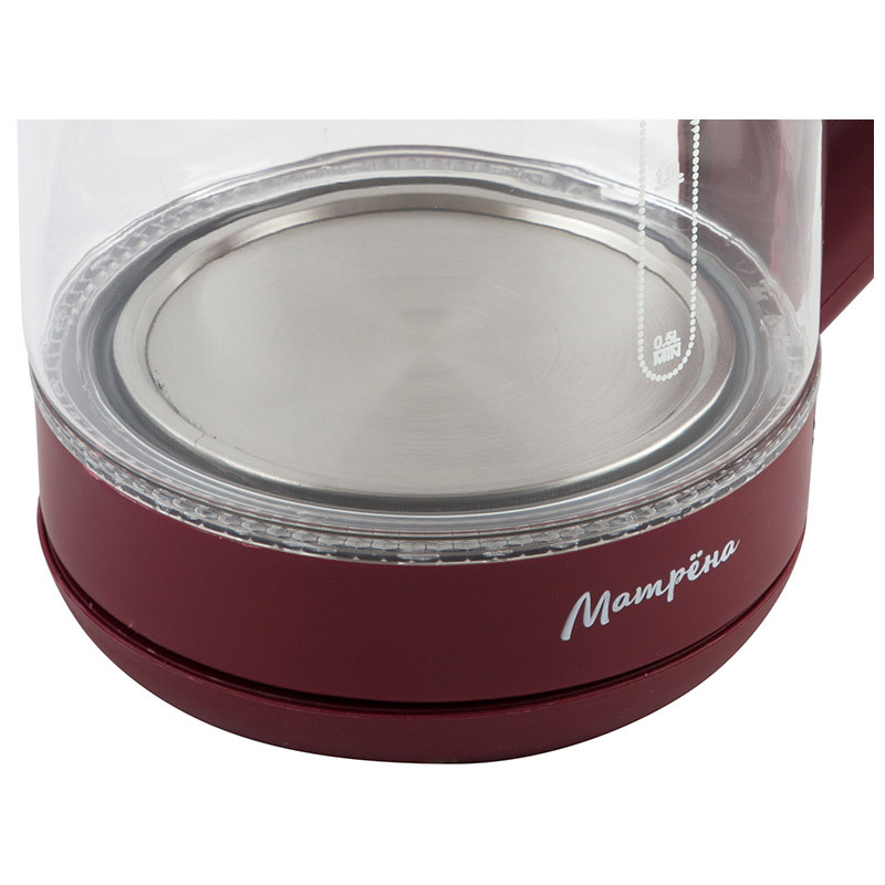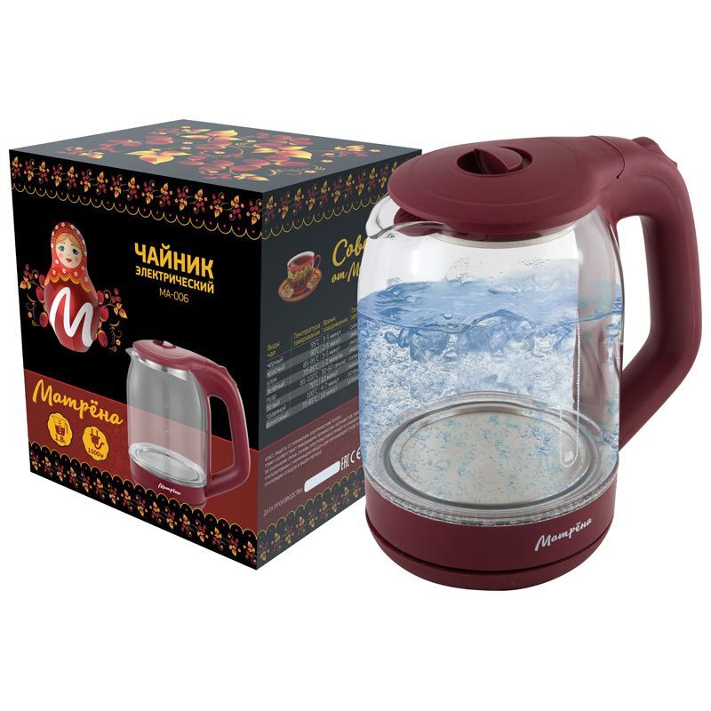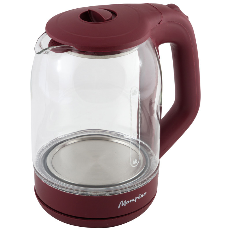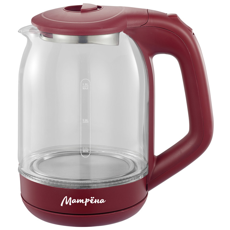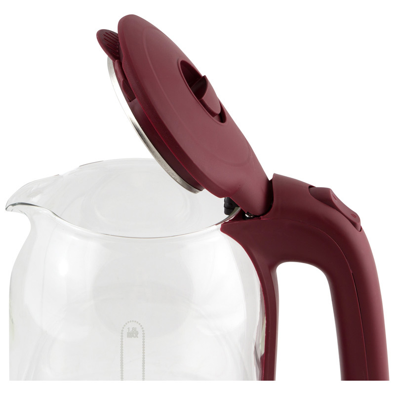 Объем 1,8 л Корпус из термостойкого стекла Шкала уровня воды Внутренняя подсветка Закрытый нагревательный элемент из нержавеющей стали Поворот на подставке 360° Защита от работы без воды Автоматический выключатель Место для хранения шнура Мощность 1500 Вт Цвет вишнёвый