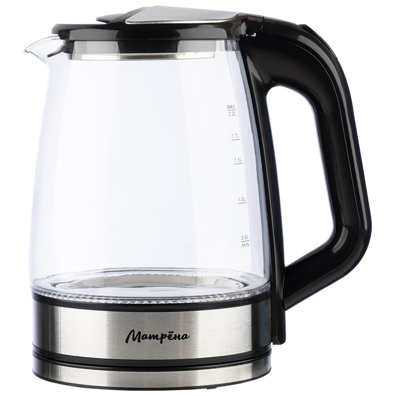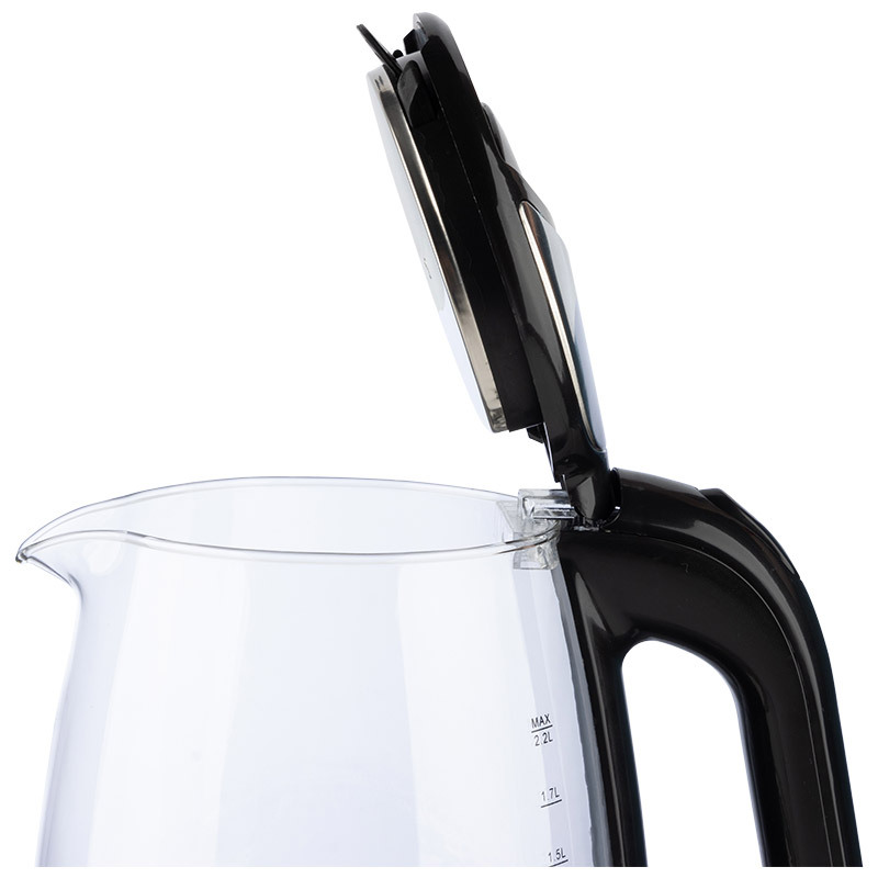 Объем 2,2 л Корпус из термостойкого стекла Шкала уровня воды Внутренняя подсветка Закрытый нагревательный элемент из нержавеющей стали Поворот на подставке 360° Защита от работы без воды Автоматический выключатель Место для хранения шнура Мощность 1500 Вт Длина шнура 59 см