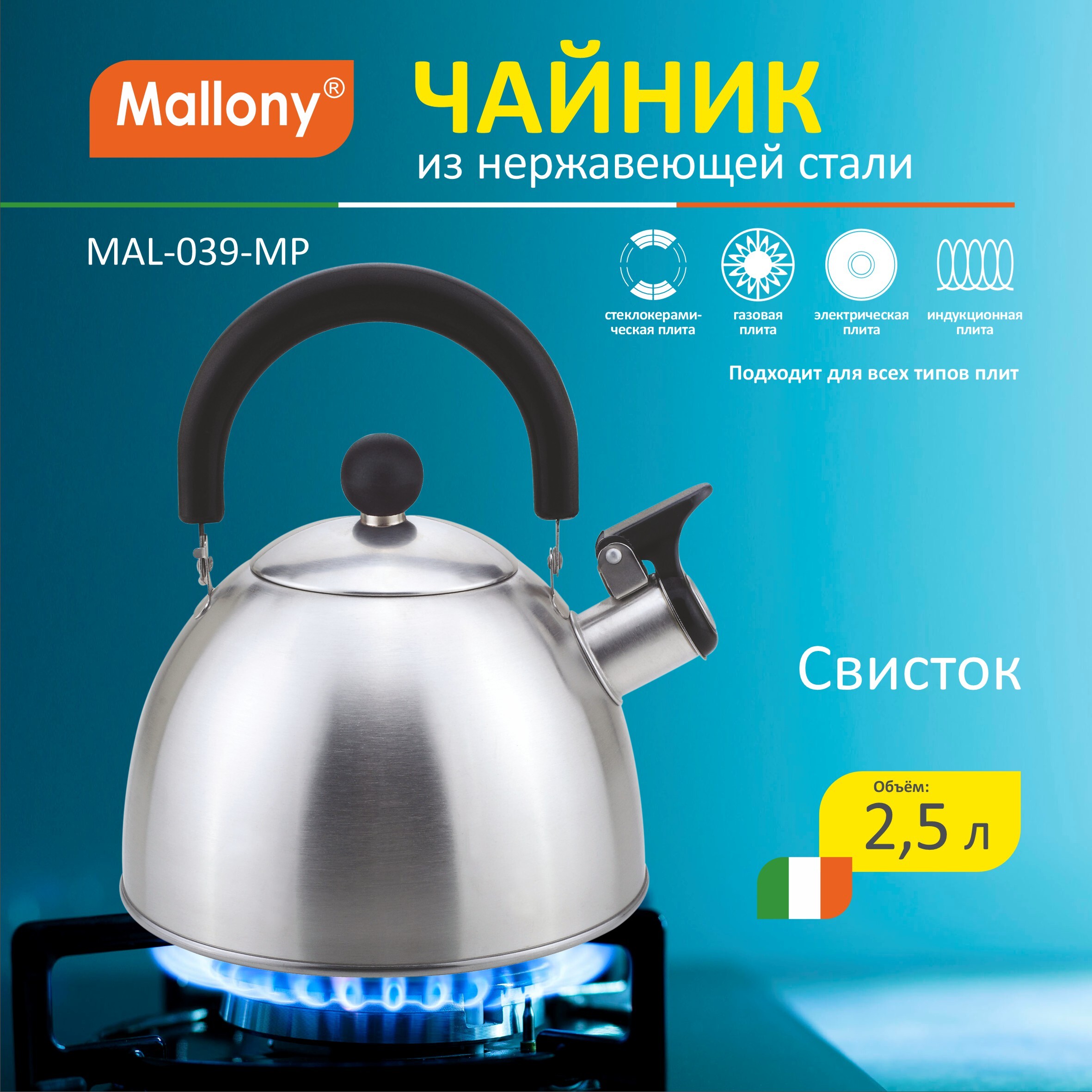 Чайник из нерж. стали со свистком, матовая полировка корпуса. Эконом-вариант для проведения промо-акций. Толщина стали от 0,3 мм. Объем - 2,5 литра, Материалы - нерж сталь, нейлон Однослойное дно Со свистком Подходит для всех типов плит. Не рекомендуется мыть в посудомоечной машине.