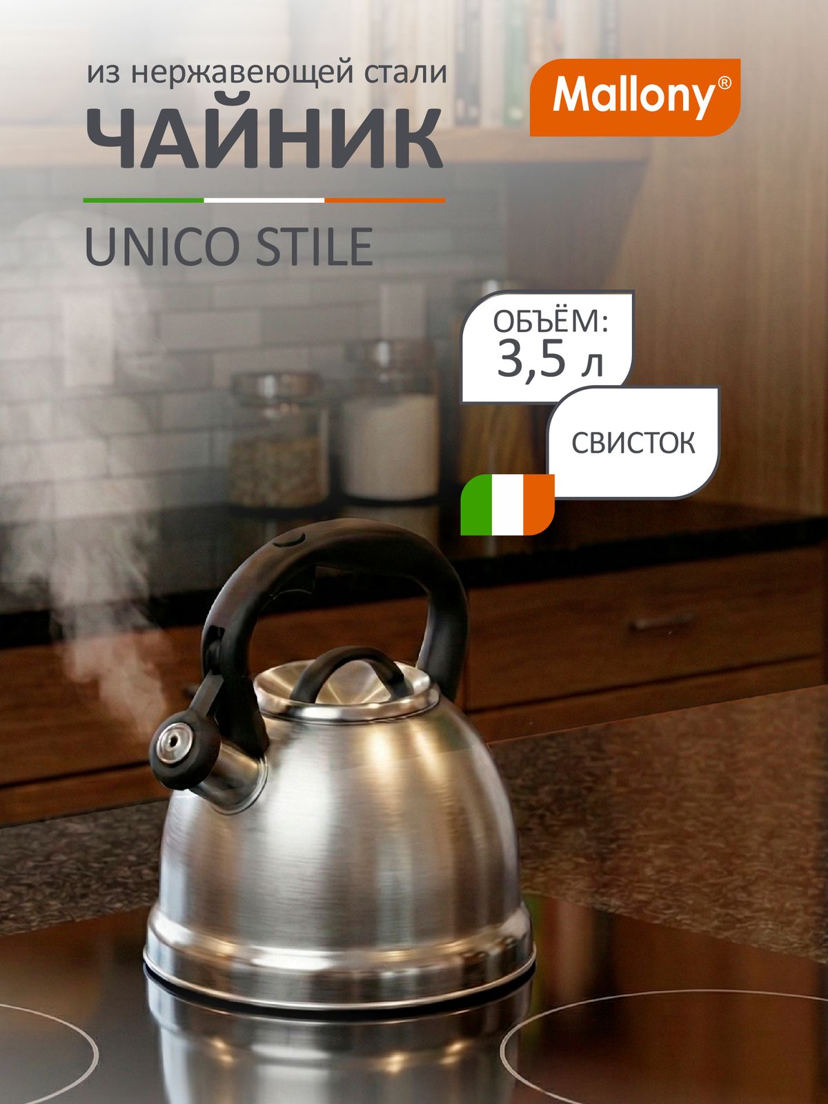 Чайник UNICO STILE, объем 3,5 л, из нерж стали со свистком, смешанная полировка, ручка с soft-touch Материал: нерж сталь, алюминий, сталь, нейлон, силикон. Объем: 3,5 л. Толщина стенок: 0,35 мм. Дно 3-слойное капсулированное. Подходит для всех типов плит. Корпус: смешанная полировка (матовый/нижняя часть с зеркальной полировкой). Внутри: матовый.