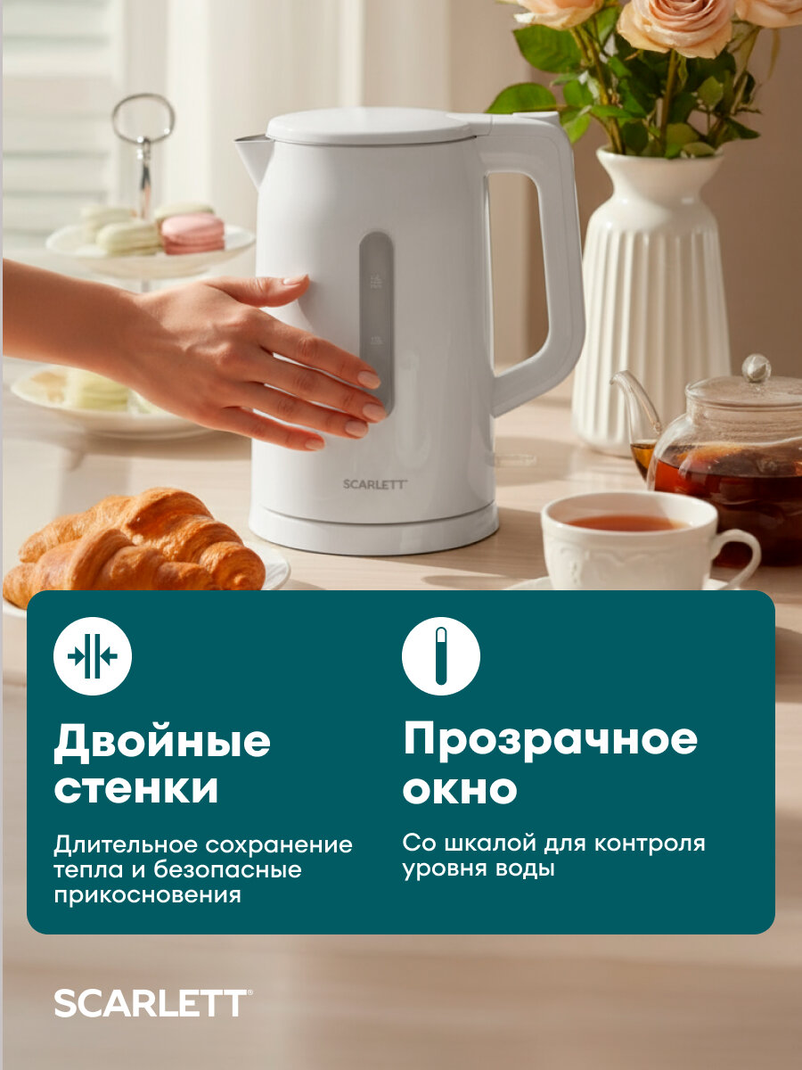 Двойные стенки корпуса чайника помогают сохранить тепло и обеспечить безопасное прикосновение.