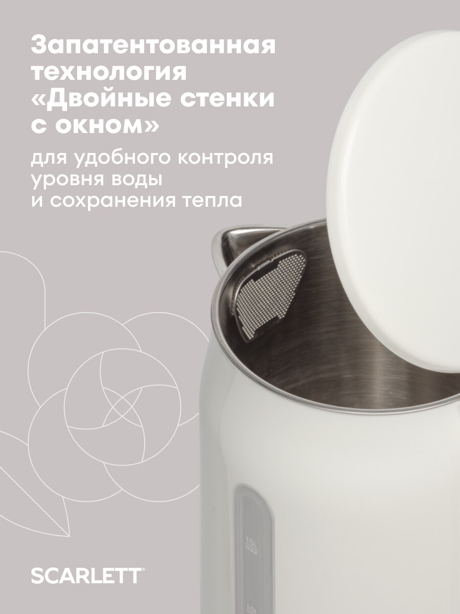 Scarlett SC-EK21S31 – электрический чайник мощностью 2200 Вт и объемом 1.5 л оснащён автоматической системой открывания крышки.