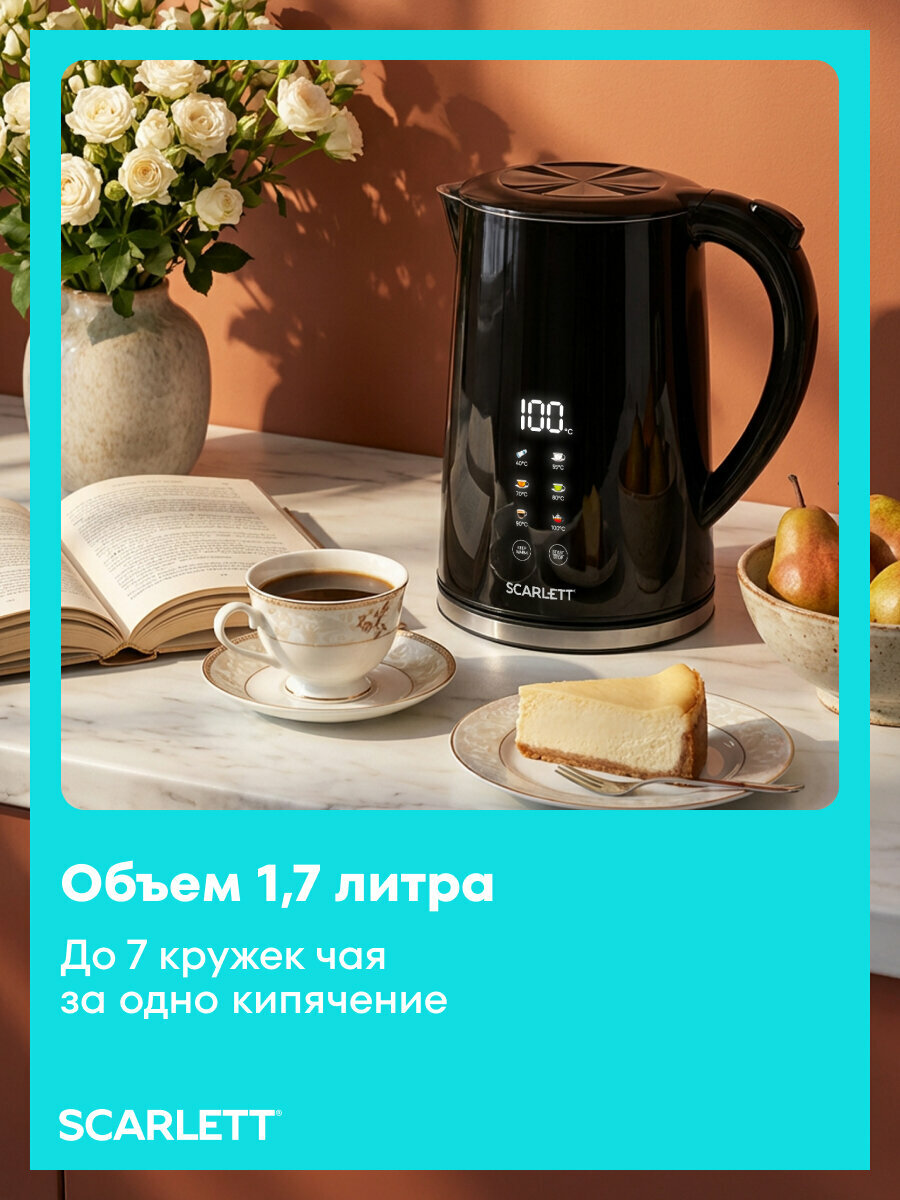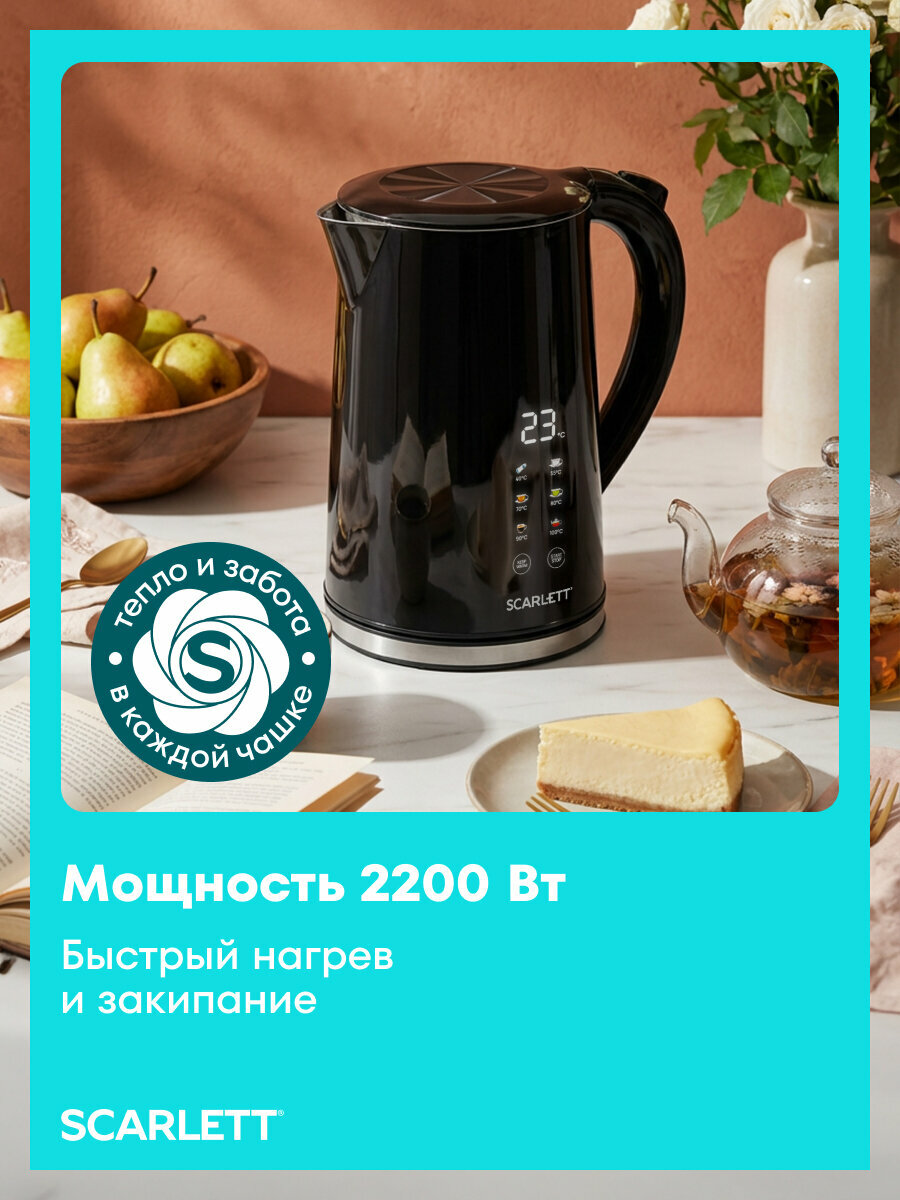 Scarlett SC-EK21S66 – электрический чайник с сенсорным управлением, мощностью 2200 Вт и объемом 1.7 л.