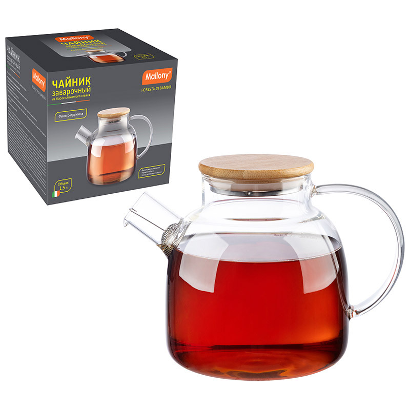Чайник заварочный Foresta di bambù, объем 1,5 л, из боросиликатного стекла с крышкой из бамбука Материал: жаропрочное боросиликатное стекло (корпус), 304 нерж сталь (фильтр на носике), крышка из бамбука/силикона/нерж стали. Объем: 1,5 л. Размер: 16*10,5*16 см