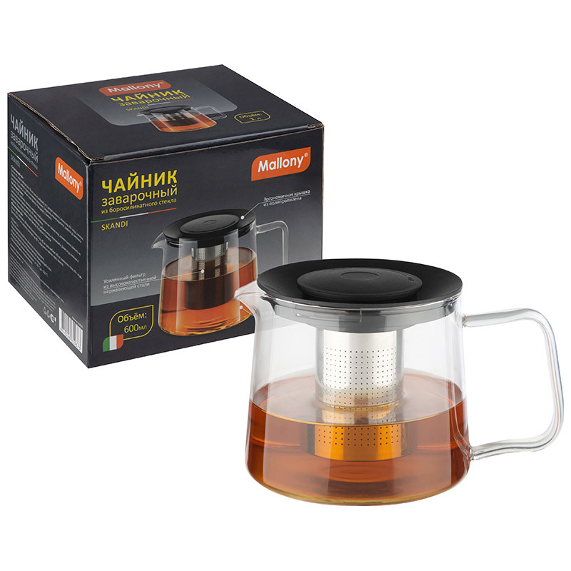 Чайник заварочный Skandi, объем 600 мл, из боросиликатного стекла, с прямоугольной ручкой Материал: жаропрочное боросиликатное стекло (корпус), 304 нерж сталь (фильтр), крышка из полипропилена. Объем: 600 мл. Размер: 11,5*10,5*9 см.