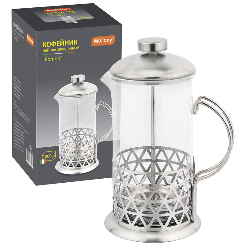 Кофе-пресс/чайник заварочный серия Rombo, объем 1000 мл, тм Mallony Предназначен для заваривания чая, кофе, прочих напитков. Коэффициент линейного расширения - 3,0. Корпус/фильтр/стержень из нержавеющей стали № 201, колба из жаропрочного боросиликатного стекла. Крышка - нерж сталь № 201/пластмасса. Толщина стекла - 0,8 мм Толщина нерж стали - 0,3 мм Можно мыть только стекл колбу в посудомоечной машине, остальные части не рекомендуется мыть в посудомоечной машине (можно мыть мягким моющим средством и теплой водой, хорошо просушивать).