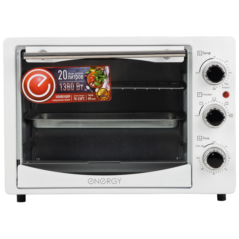 Внутренний объём 20 л Термостат с диапазоном температур 70-230ºС Таймер 60 минут 3 режима работы (верх, низ, верх+низ) Конвекция Индикатор работы Металлическая решетка, противень, поддон для жира Цвет белый Класс энергоэффективности B Мощность: 1380 Вт