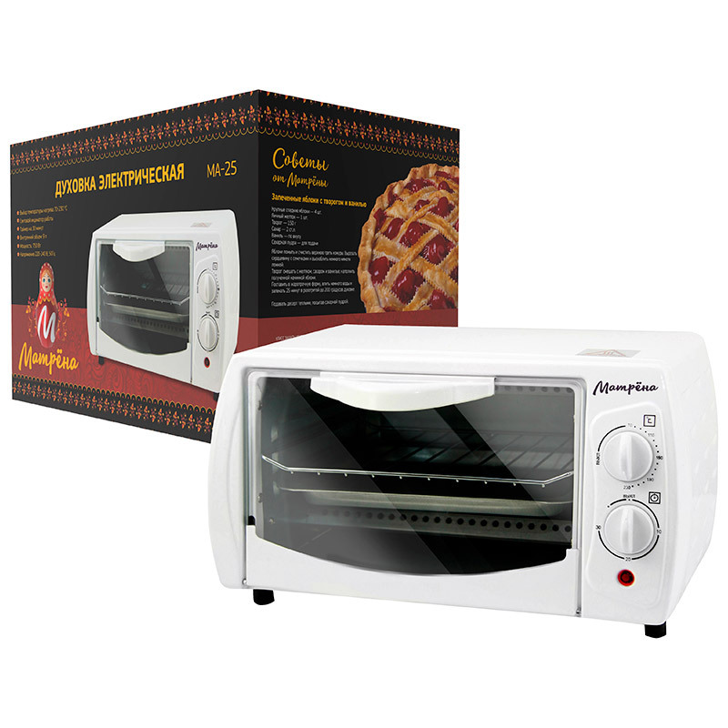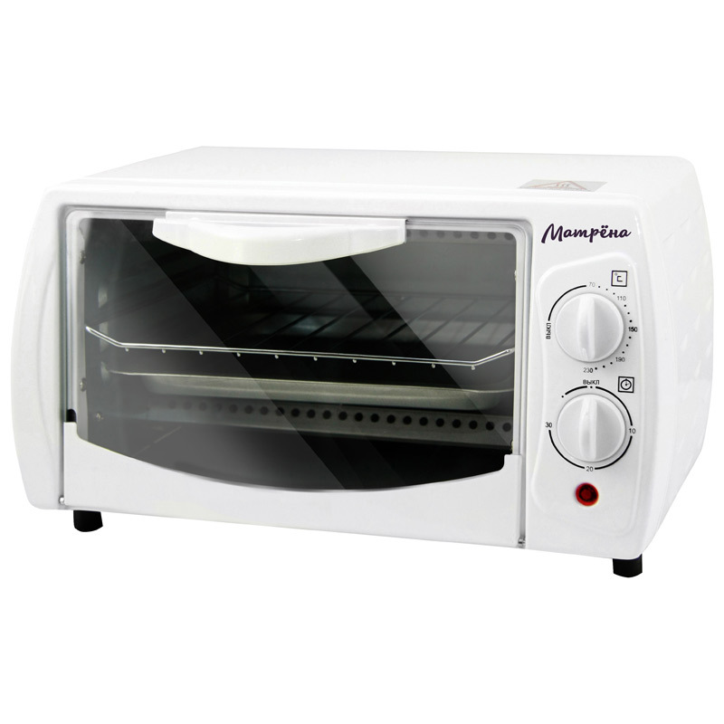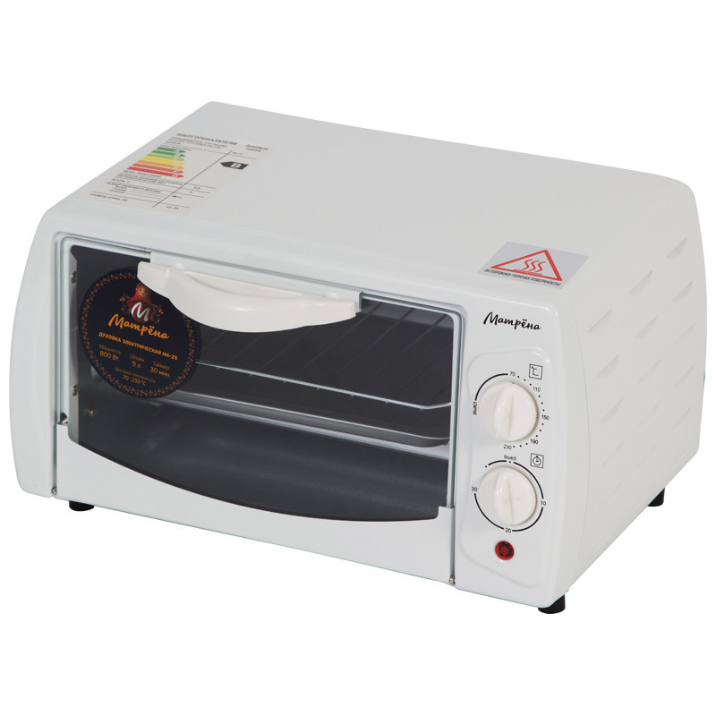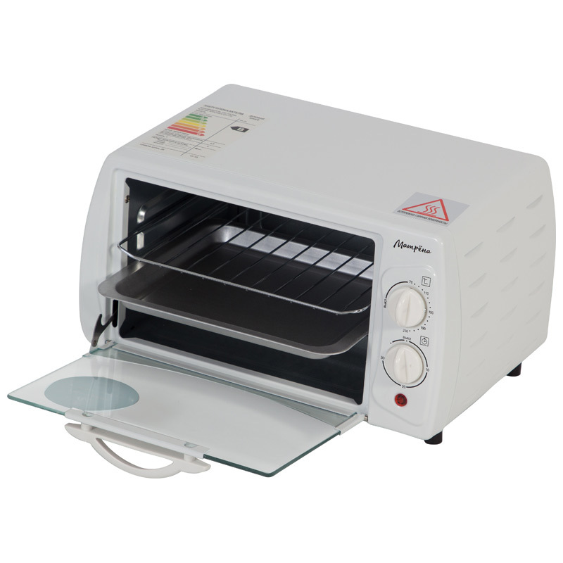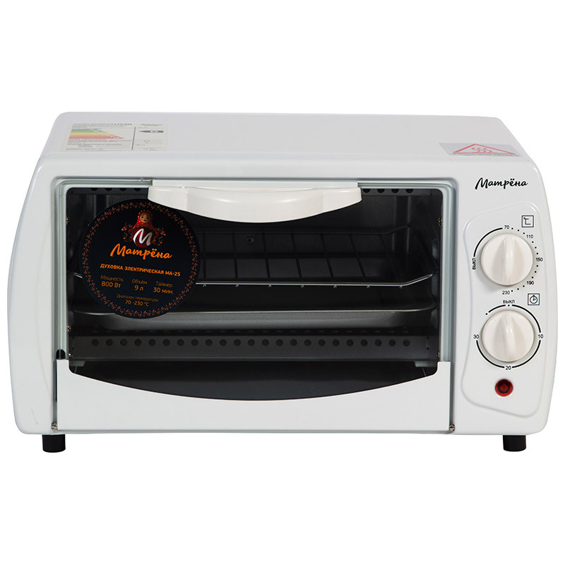 Внутренний объём 9 л Термостат с диапазоном температур 70-230ºС Таймер 30 минут Индикатор работы Металлическая решетка, противень Мощность 800 Вт Цвет белый Класс энергоэффективности B Длина шнура 80 см