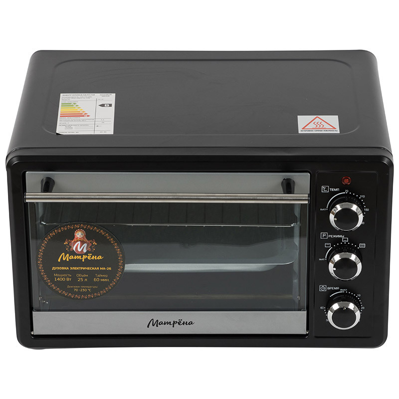 Внутренний объём 25 л Термостат с диапазоном температур 70-230ºС Таймер 60 минут 3 режима работы (верх, низ, верх+низ) Индикатор работы Металлическая решетка, противень Мощность 1400 Вт Цвет чёрный Класс энергоэффективности B