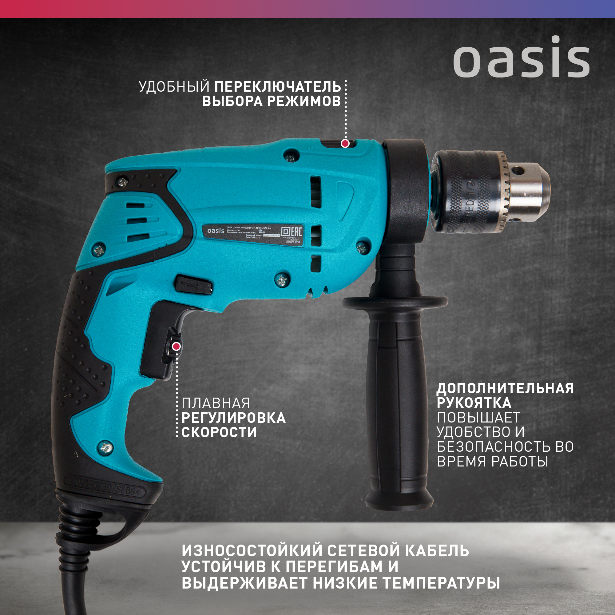 Ударная дрель Oasis DU-60 работает от сети, что обеспечивает стабильное питание и возможность использования в любом месте.