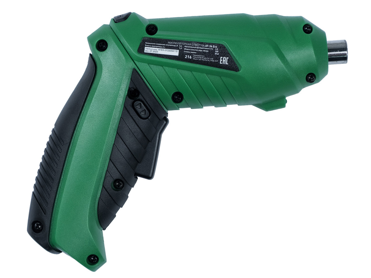 Отвертка электрическая аккумуляторная AT-36 Eco: обороты холостого хода 250 об/мин, максимальный крутящий момент 3,5 Н·м, максимальный диаметр сверления в древесине 6 мм, в стали 3 мм, в бетоне 4,5 мм; емкость аккумулятора 1,3 А·ч.