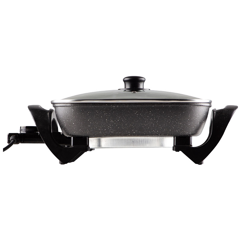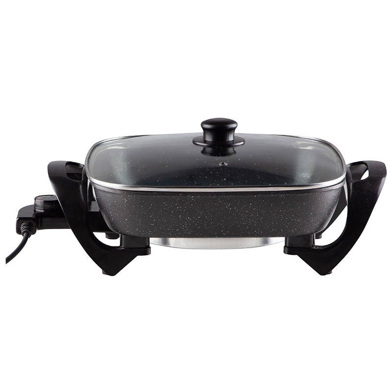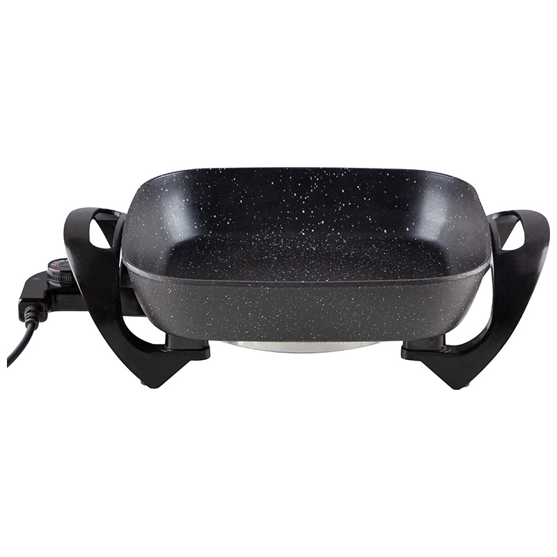 Внешний размер 30*30 см Высота: 6 см Емкость: 5 л Мощность: 1350 Вт 5 режимов температуры Материалы: алюминий с антипригарным покрытием, закаленное стекло, сталь Термостойкие ненагревающиеся ручки Мраморно-черный цвет Напряжение: 220 -240 В,50-60 Гц Длина шнура 96 см