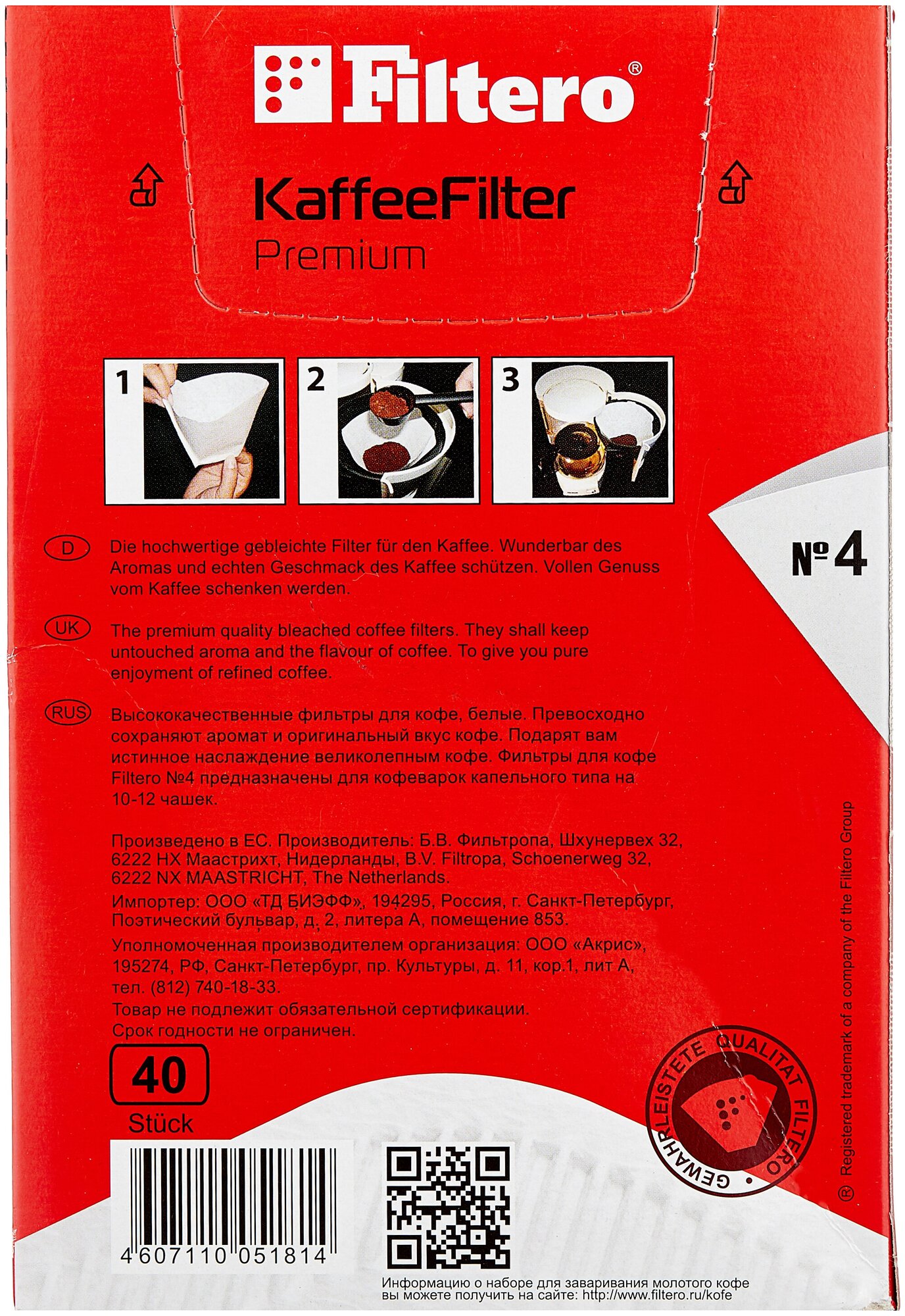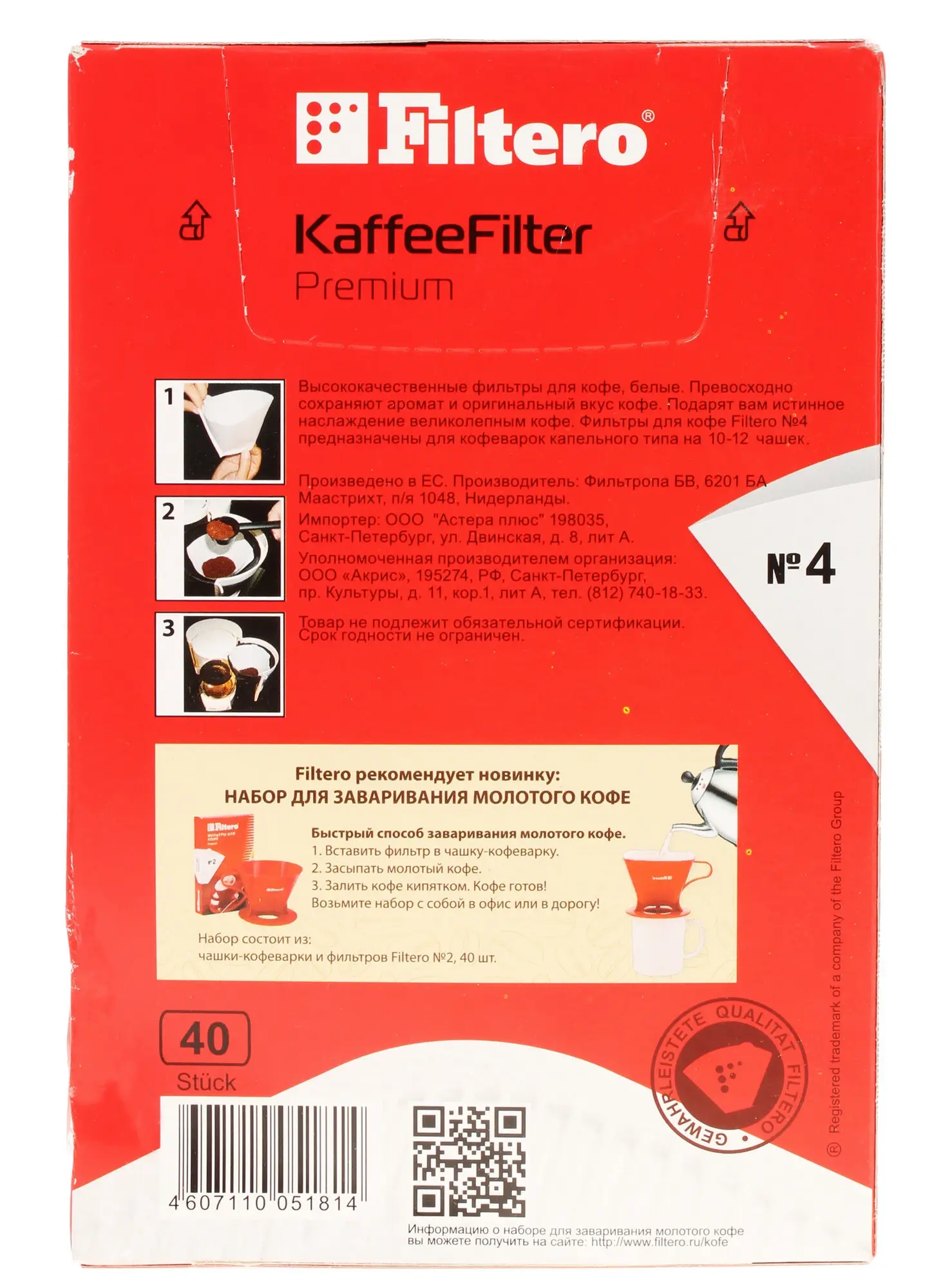 В пачке Filtero Premium №4 содержится ровно 40 фильтрующих элементов, каждый из которых можно растянуть на 10-12 порций кофе. В итоге с помощью этого комплекта вы можете очистить от гущи и горечи около 320 чашек кофе.