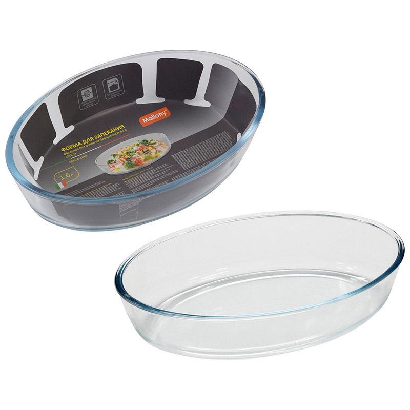 Форма для запекания из боросил стекла 1,6 л, овальной формы без ручек, серия Cristallino, тм Mallony Литраж: 1,6 л /Размер: 25,8X17,9X6,0 см. Толщина стекла - 5,4 мм. Материал - высококачественное боросиликатное стекло - подходит для использования в духовке, микроволновке, морозильной камере. Выдерживает высокие температуры от минус 40 до плюс 300 С без резких перепадов. Предназначена для запекания блюд в духовках, СВЧ, хранения пищи в холодильнике/морозильной камере. Не рекомендуется использовать на плитах. Можно мыть в посудомоечной машине. Коэффициэнт линейного расширения - 3.7(+/-0.1)*10 -6/K Упаковка - цветной вкладыш+термоусадка+ч/б стикер 6*4 см поверх термоусадки с боковой стороны, коробка с ячейками.