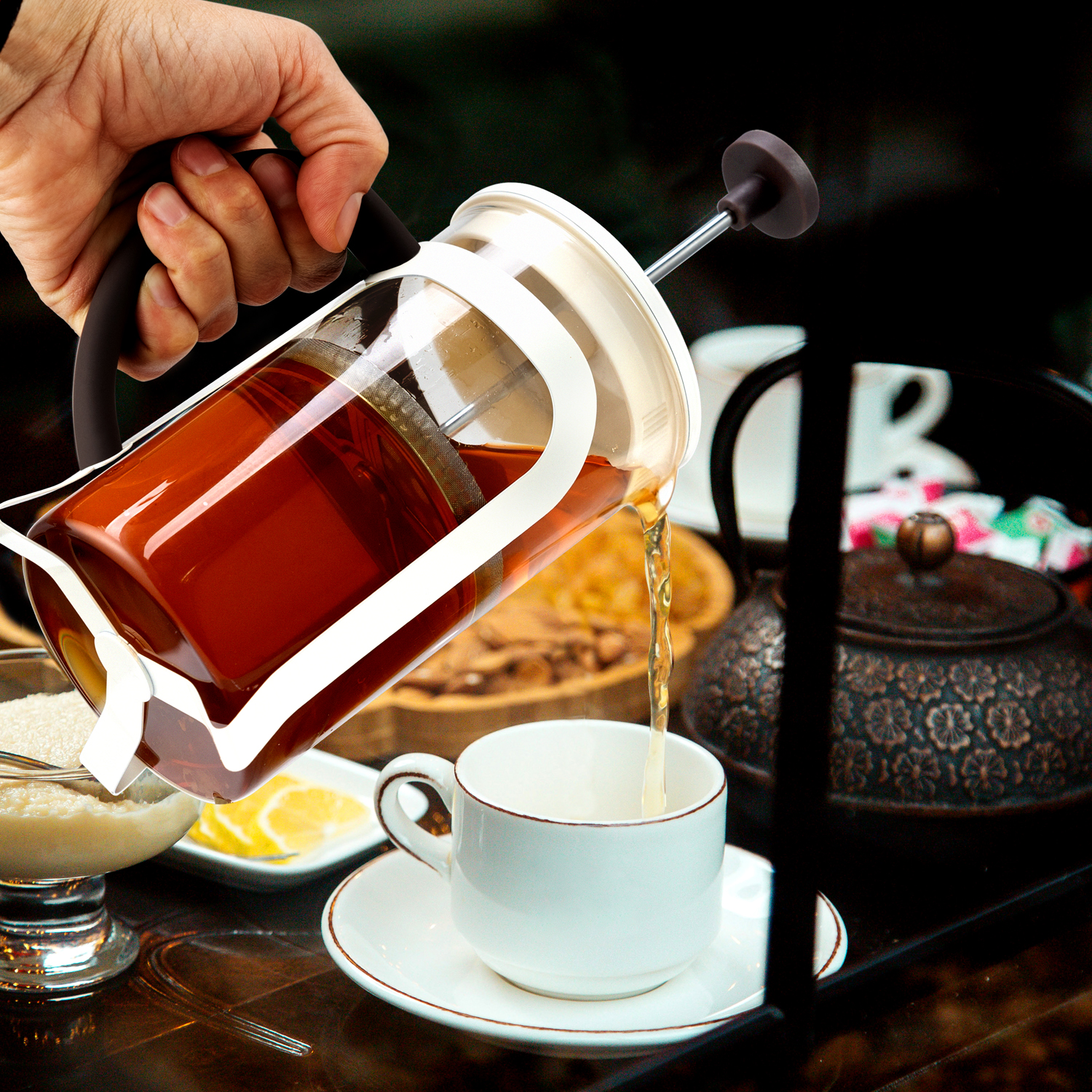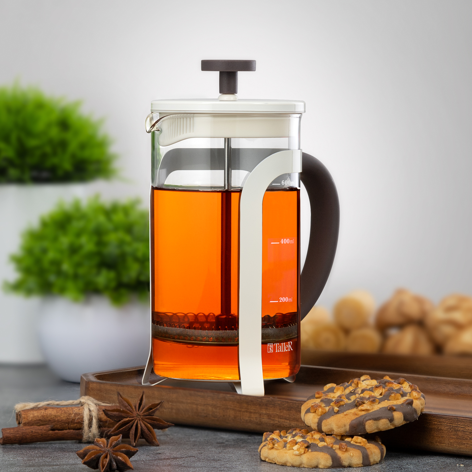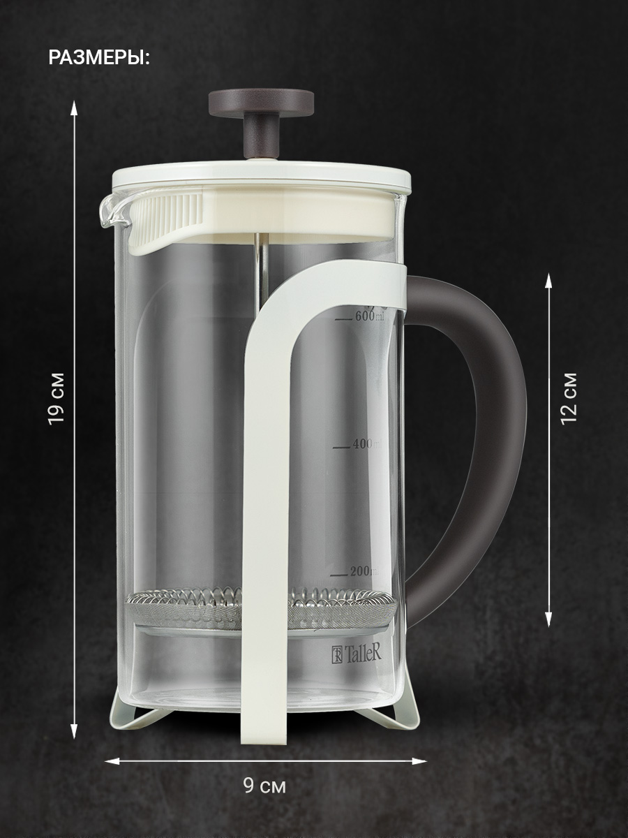 Колба выполнена из боросиликатного стекла, устойчивого к перепадам температур. Корпус выполнен из высококачественной нержавеющей стали 18/10 (AISI 304) и безопасного пищевого пластика (РР). Пресс выполнен из высококачественной нержавеющей стали 18/10. Цвет корпуса и крышки - молочный. Цвет ручек - коричневый. Удобная ненагревающаяся ручка. Отметки литража на колбе. Идеален для приготовления кофе, чая, тонизирующих и расслабляющих напитков.