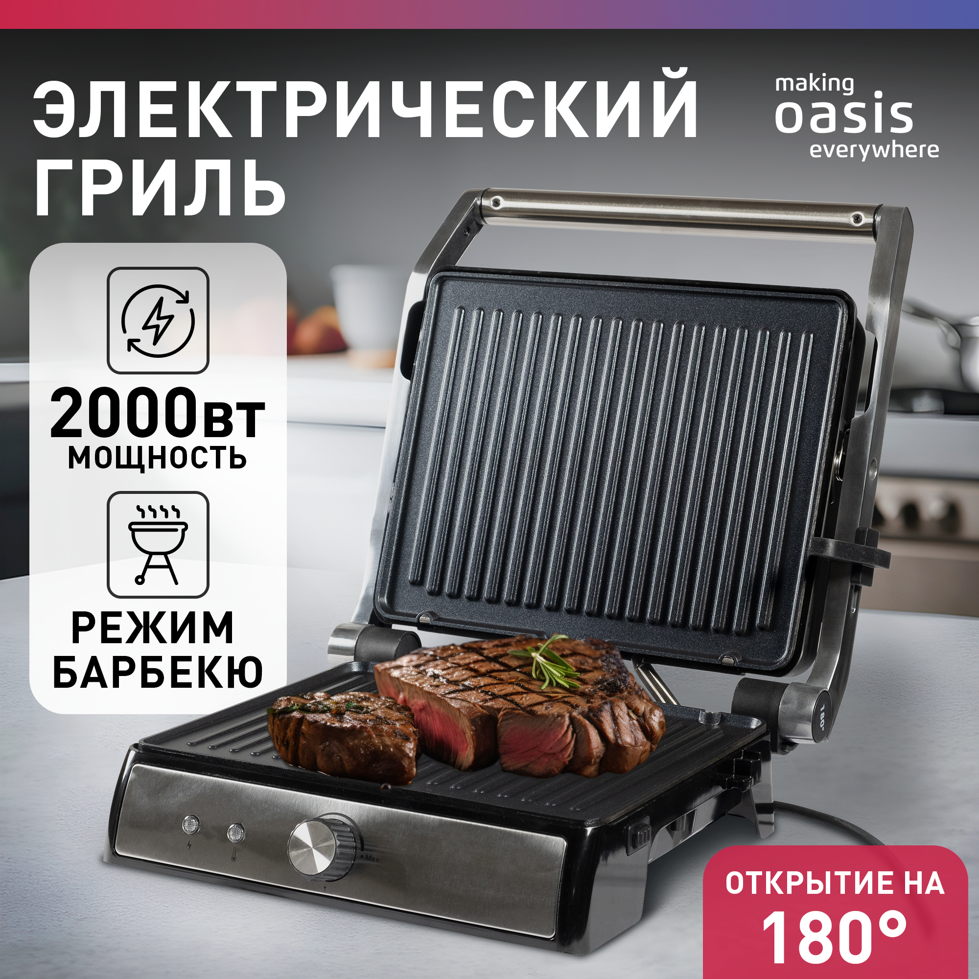 Электрический гриль making Oasis everywhere GR-1S - это незаменимый помощник на кухне, который позволяет наслаждаться блюдами на гриле даже в городской квартире. Мощность гриля составляет 2000 Вт, что обеспечивает быстрое и равномерное нагревание рабочей поверхности. Благодаря этому, вы сможете приготовить аппетитную корочку на продуктах, делая их сочными и нежными внутри. Рабочая поверхность гриля раскрывается на 180°, что дает возможность готовить сразу на двух панелях. Это позволяет жарить овощи, мясо или морепродукты для барбекю-вечеринки или делать бургеры, обжаривая котлеты на одной стороне и подрумянивая булочки на другой. Гриль оснащен теплоизолированной ручкой, которая не дает обжечься при готовке. Механическое управление удобное и простое, выбор необходимой температуры сразу включает гриль. Индикатор показывает, когда панели нагрелись и готовы к работе. Антипригарное покрытие защищает от пригорания пищи и легко очищается. Дополнительными функциями гриля являются: защита от перегрева, регулировка высоты верхней панели, возможность использования верхней панели как самостоятельной, раскрытие на 180 градусов и лоток для сбора жира. Материал корпуса - сталь, что гарантирует долговечность и надежность гриля. Вес гриля составляет 3,45 кг, а его размеры - 35,7х34х14 см. Выбирая электрический гриль making Oasis everywhere GR-1S, вы получаете качественный и функциональный кухонный прибор, который станет незаменимым помощником на вашей кухне.