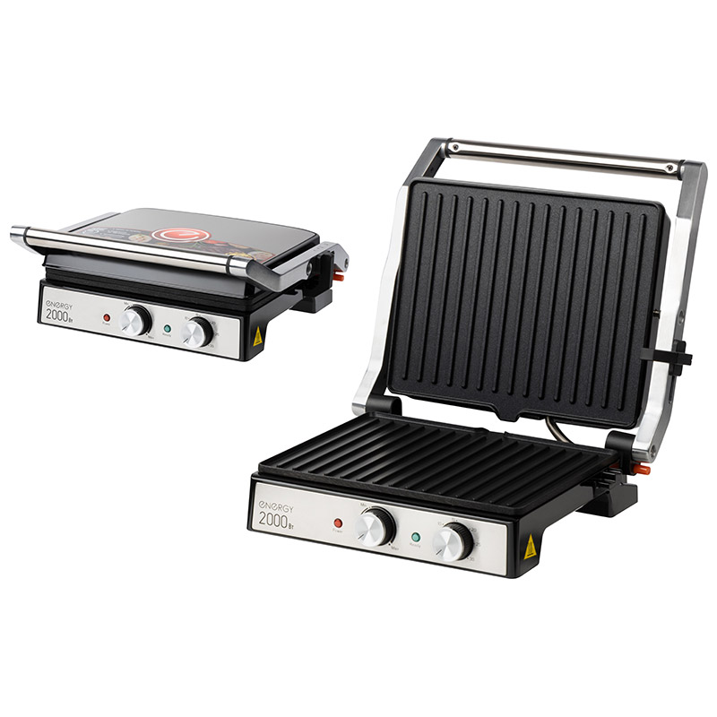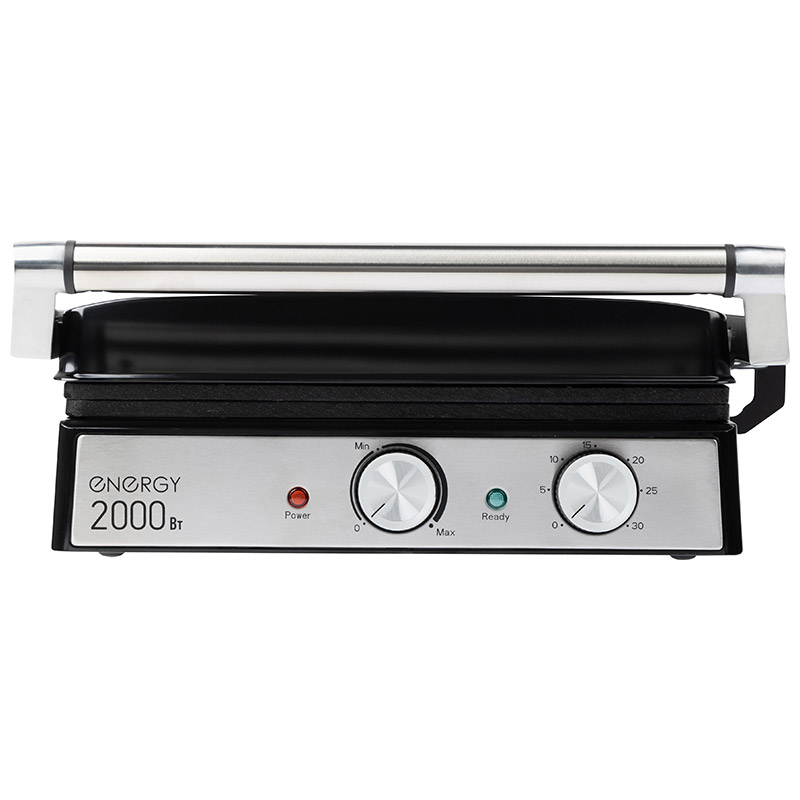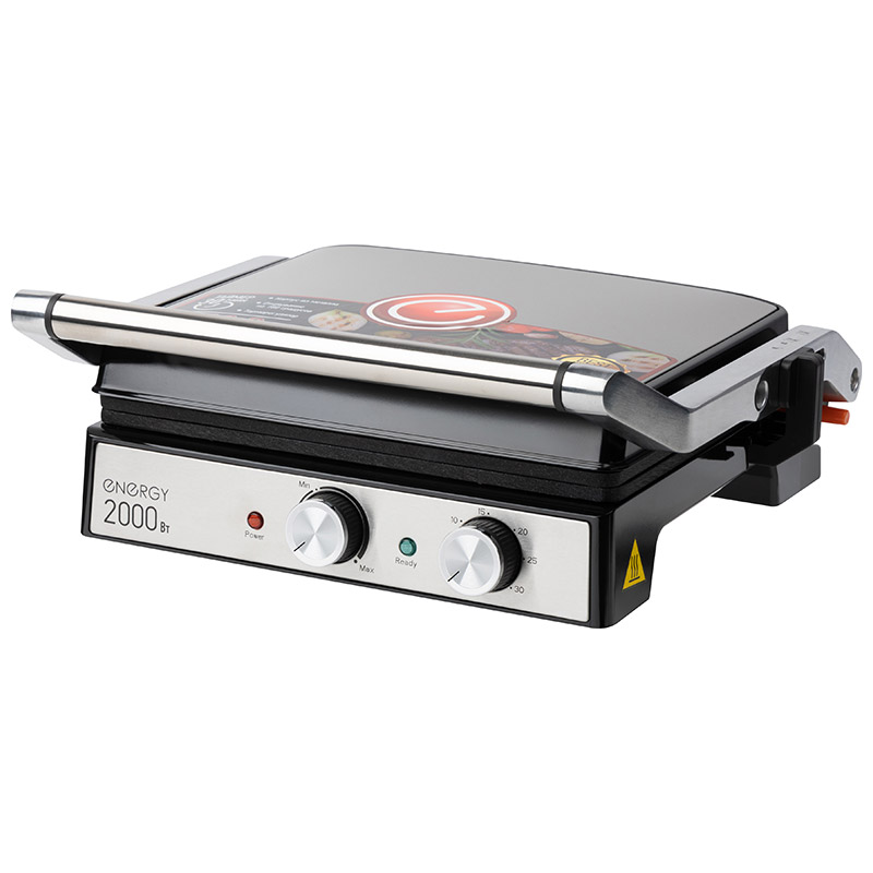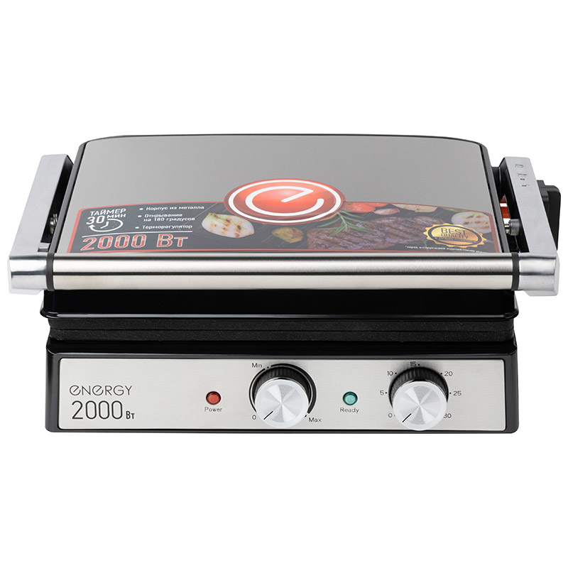 Гриль Световой индикатор работы и нагрева Терморегулятор Таймер на 30 минут Ненагревающаяся ручка Прорезиненные ножки Поддон для сбора жира Корпус их термостойкого пластика и металла Открывание на 180 градусов Мощность 2000Вт
