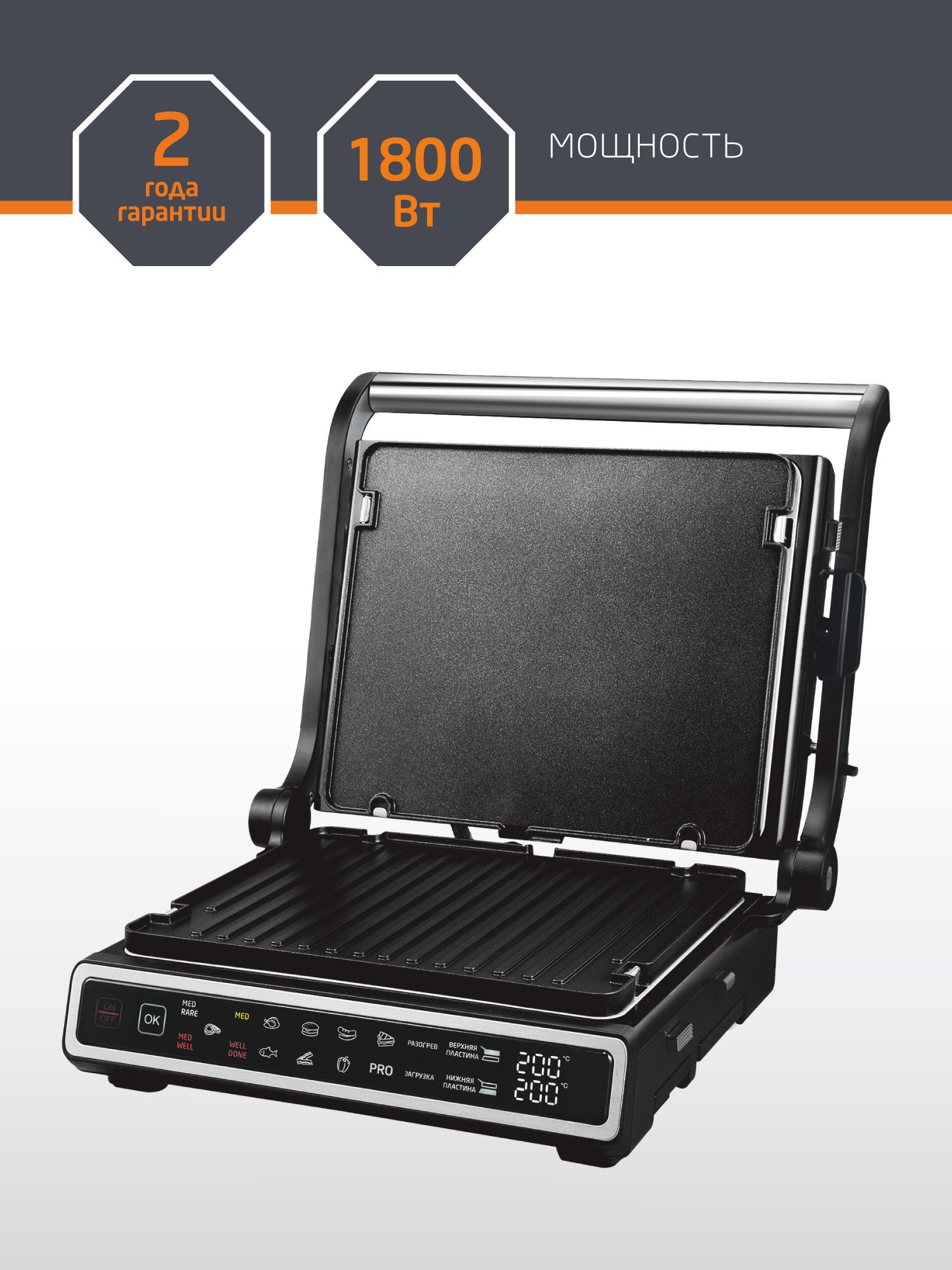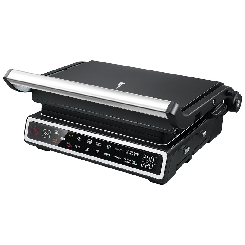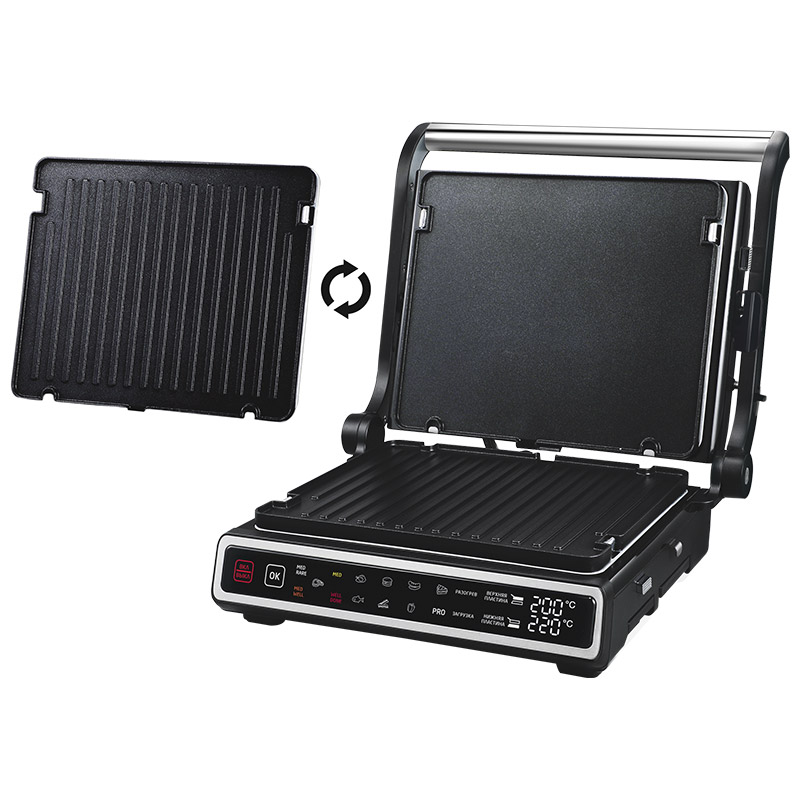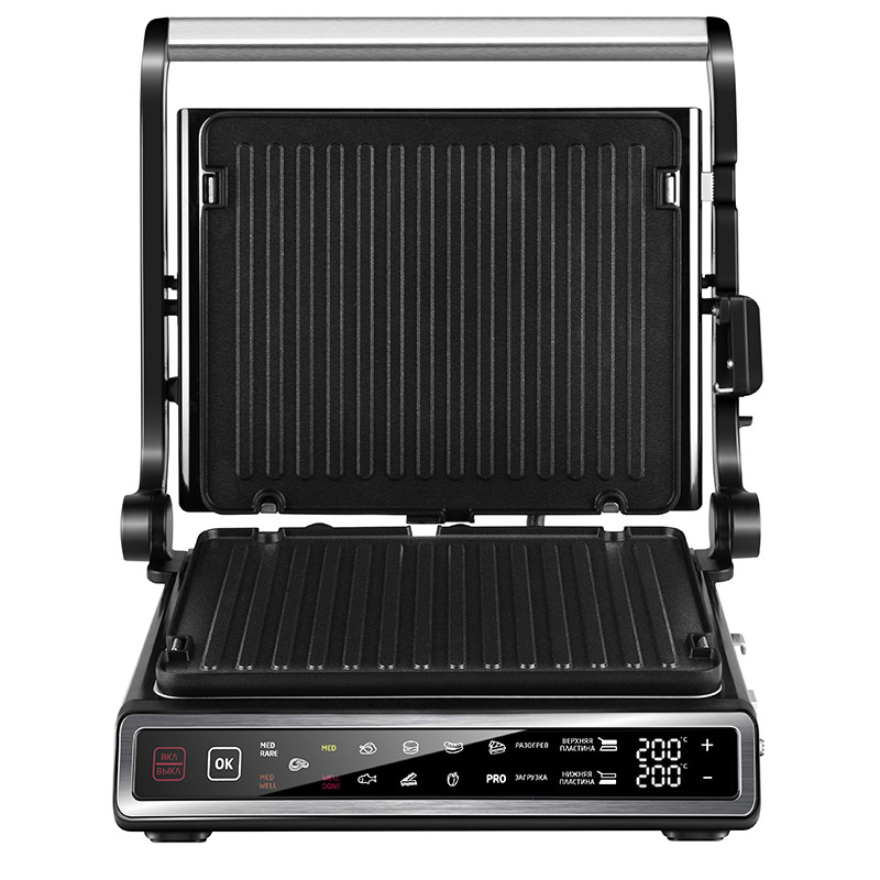 Мощность 1800 Вт Съемные двусторонние пластины "Universal Side": - рифлёная для стейков - гладкая для блинчиков и овощей Размер пластин 28*23,5см Сверхпрочное антипригарное покрытие TouchPro7 11 автоматических программ 4 степени прожарки стейков Ручной режим "Cooking PRO" Отдельная регулировка температуры для верхней и нижней пластины Максимальная температура нагрева пластин 230 градусов Дисплей Сенсорное управление Поддон для cбора жира Термощуп Режим Барбекю - раскрытие на 180 градусов Защита от перегрева Пластины можно мыть в посудомоечной машине Вертикальное хранение