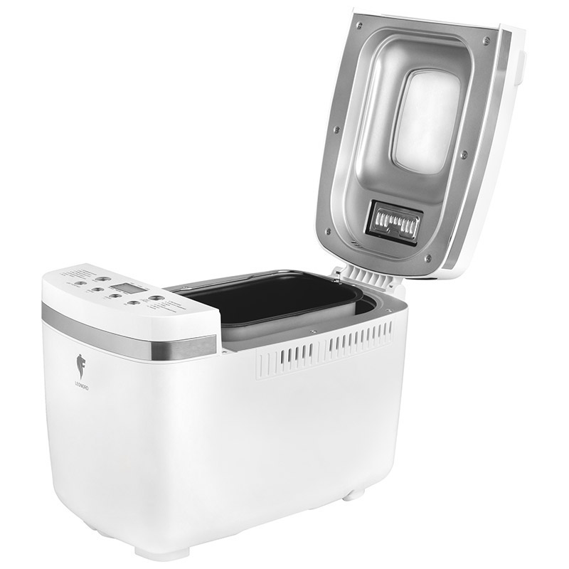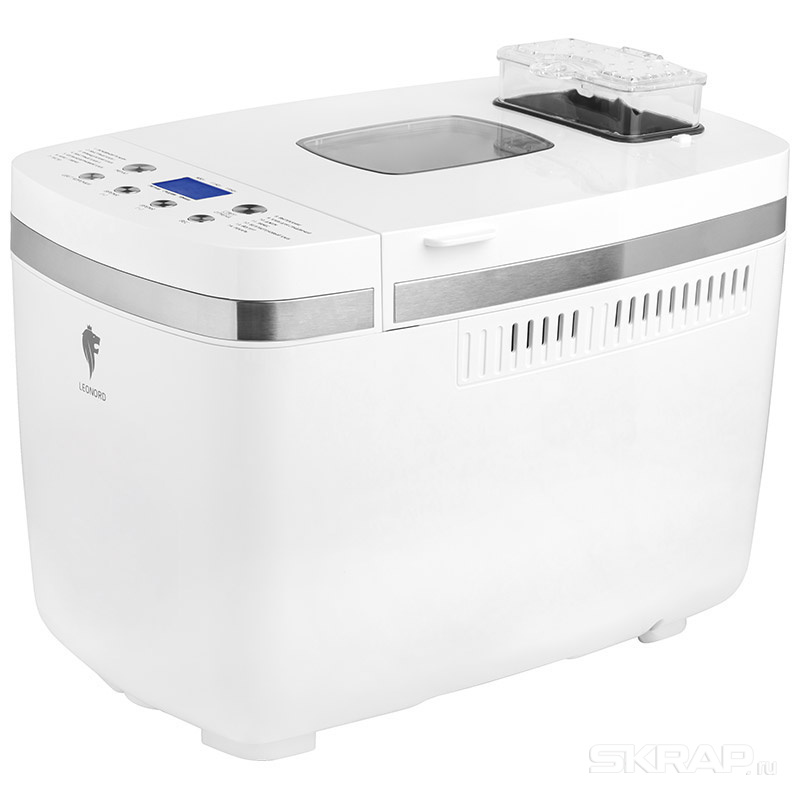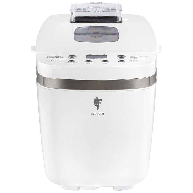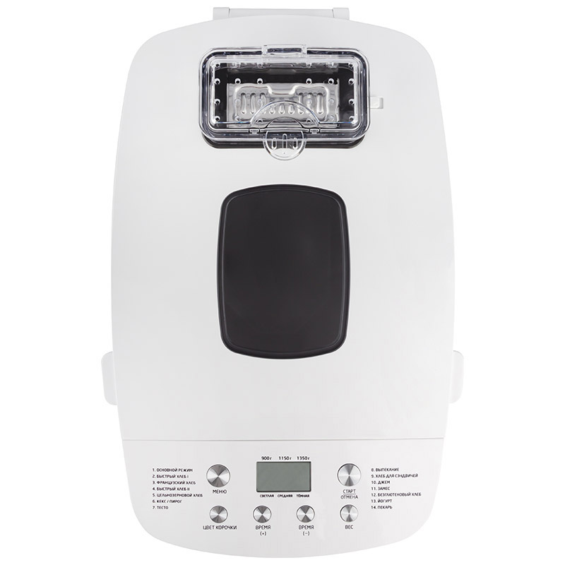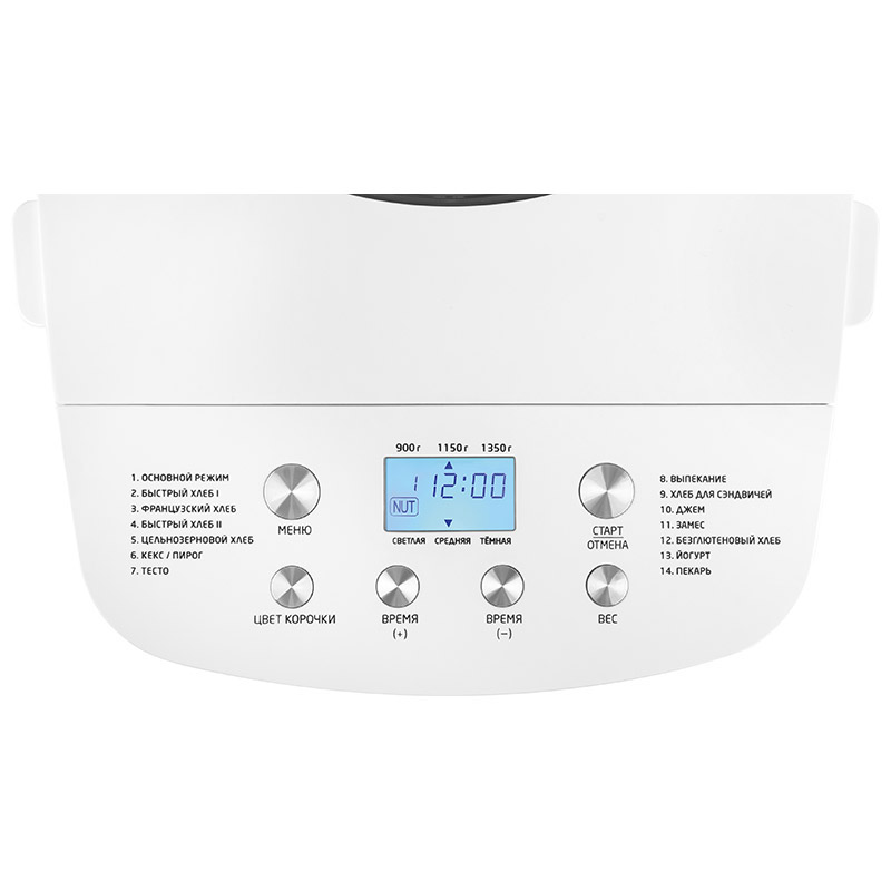 Мощность 850 Вт Размер буханки 900/1150/1350 г 14 программ приготовления: 1. Основной режим 2. Быстрый хлеб I 3. Французский хлеб 4. Быстрый хлеб II 5. Цельнозерновой хлеб 6. Кекс/Пирог 7. Тесто 8. Выпекание 9. Хлеб для сэндвичей 10. Джем 11. Замес 12. Безглютеновый хлеб 13. Йогурт 14. Пекарь 3 варианта корочки: светлая, средняя, темная Чаша с антипригарным покрытием TouchPro Окно для наблюдения за процессом приготовления LED дисплей с подсветкой Автоматический диспенсер для начинки Защита от перегрева 13-часовой таймер отсрочки старта Функция памяти 10 минут Автоматическое поддержание температуры в течение 1 часа 2 лопатки для замешивания В комплекте: мерный стаканчик, мерная ложка, крючок Цвет белый Размер 42,5*27*31,5 Гарантия 2 года Длина шнура 85 см