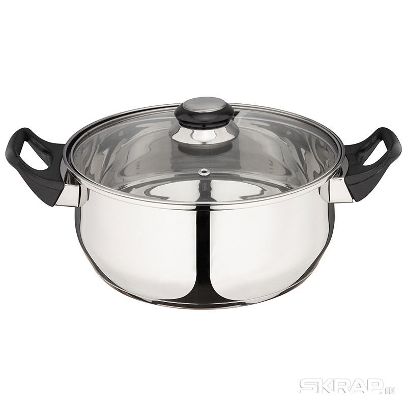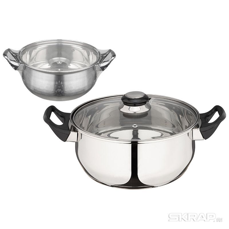 Кастрюля из нерж стали с крышкой (стекло) BAK-04, 3.9 л, ручки - бакелит, без ТМ Размер с ручками и крышкой - 32*15 см Толщина стенок - 0,3 мм, зеркальная полировка внутри и снаружи. Дно капсулированное, 3 слоя (нерж сталь + алюминий + нерж сталь). Ручки - бакелит. Упаковка: стикер+термоусадочная пленка. Не подходит для индукции. Метод производства - штамповка/тип крепления ручек точечная сварка. Не рекомендуется мыть в посудомоечной машине.