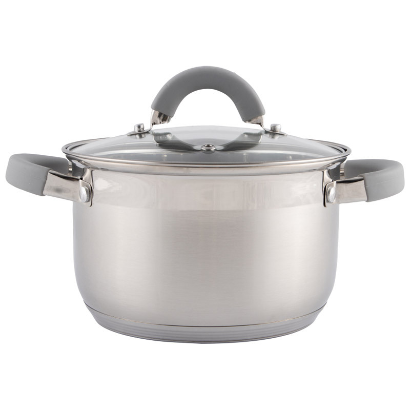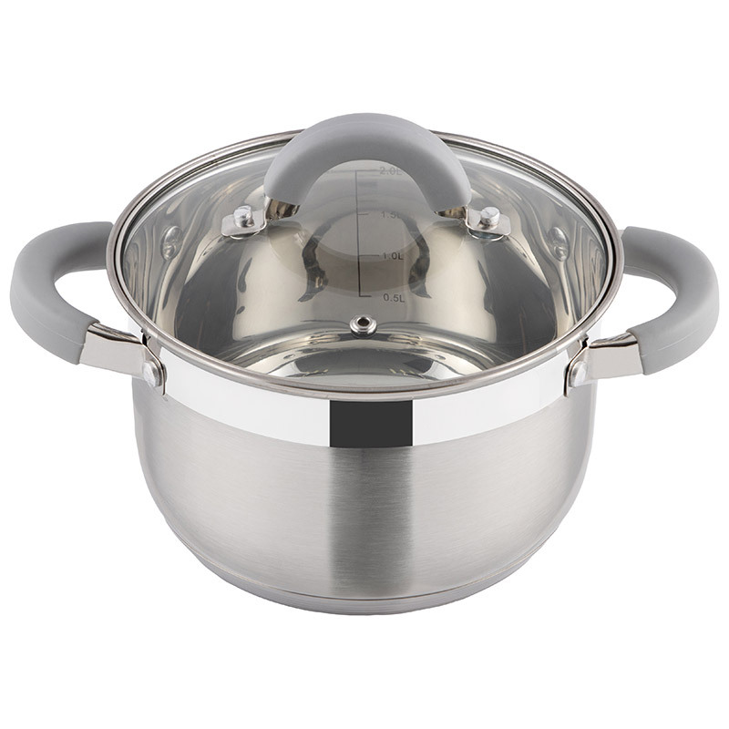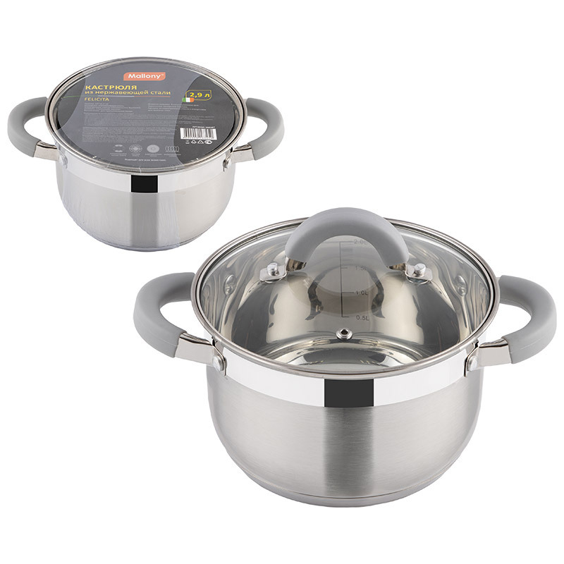Кастрюля Felicità, объем 2,9 л, из нерж стали с крышкой из жаропрочного стекла, размер 18*11,5 см Материал: нерж сталь, жаропрочное стекло, силикон, алюминий, нерж сталь, железо. Размер: 18*11,5 см/Объем: 2,9 л. Толщина стенок - 0,5 мм, 5-слойное капсулированное дно/толщина дна 3,5 мм (0,5 мм нерж сталь+0,5 мм алюминий + 1 мм железо +0,5 мм алюминий + 0,5 мм сталь). Подходит для всех типов плит. Зеркальная полировка внутри. Отметки литража. Снаружи - смешанная полировка корпуса (матовая, в верхней части зеркальная). Крышка С-типа из жаропрочного стекла с отверстием для выпуска пара. Полые ручки из нерж стали с покрытием из силикона.