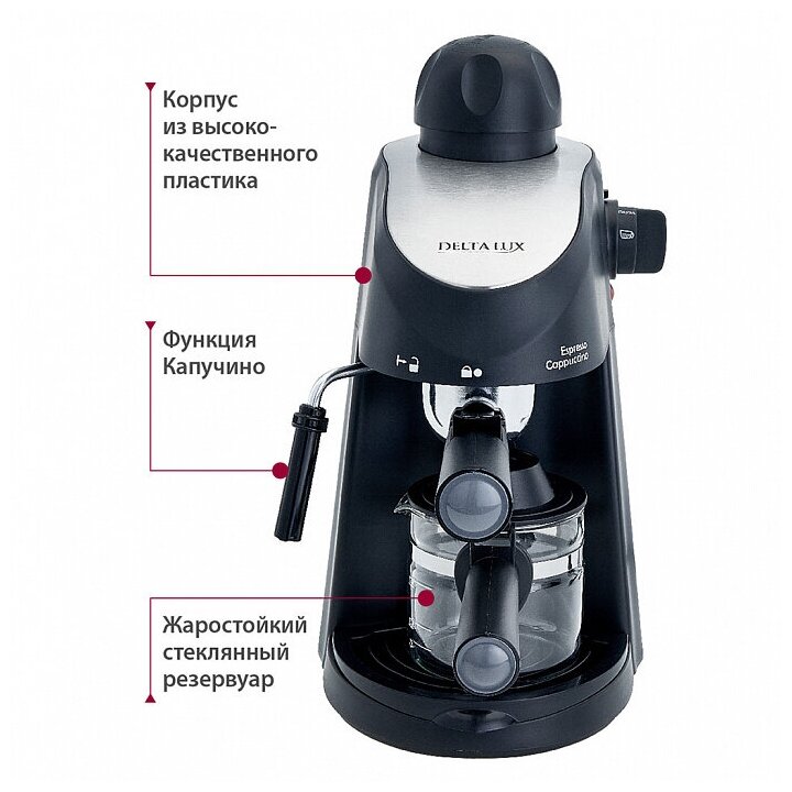 С кофеваркой DELTA LUX DL-8150К вы получите разнообразные функции, включая возможность приготовления капучино, функцию «Пауза» для остановки процесса заваривания в нужный момент, защиту от перегрева для безопасности и многое другое.
