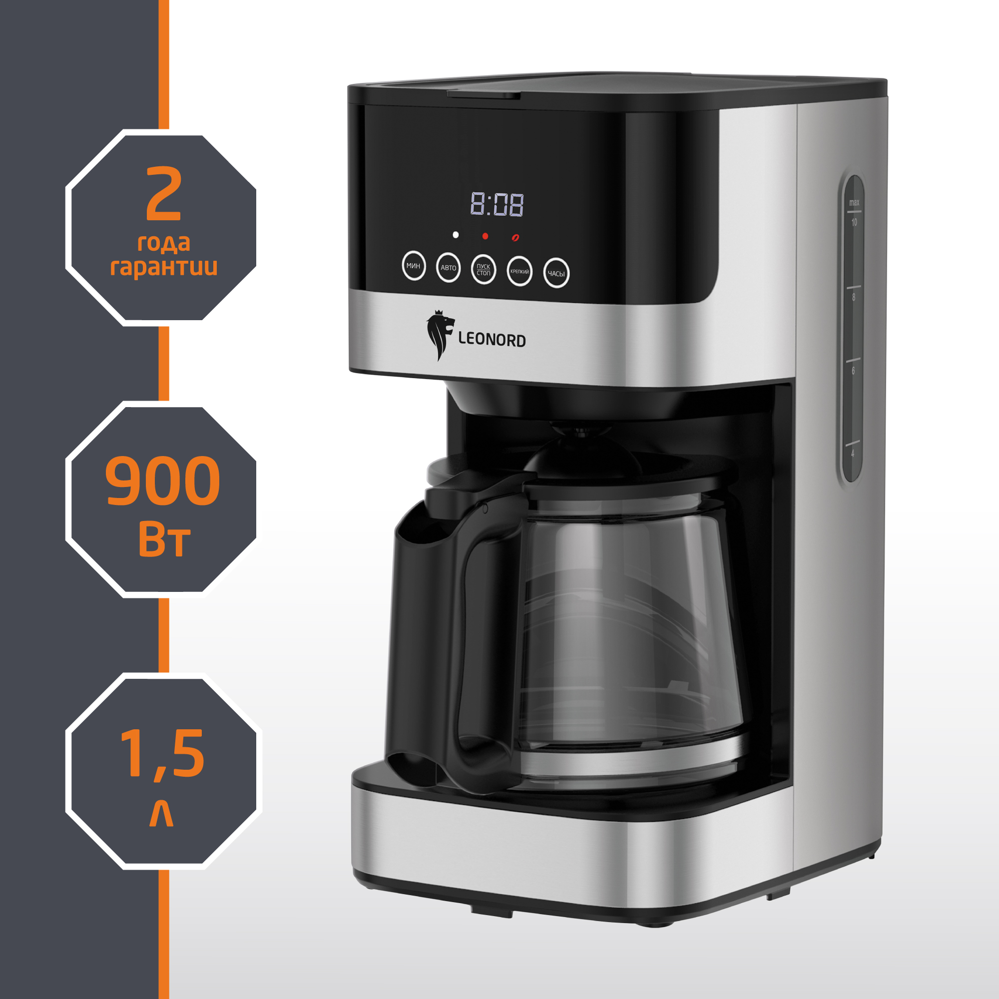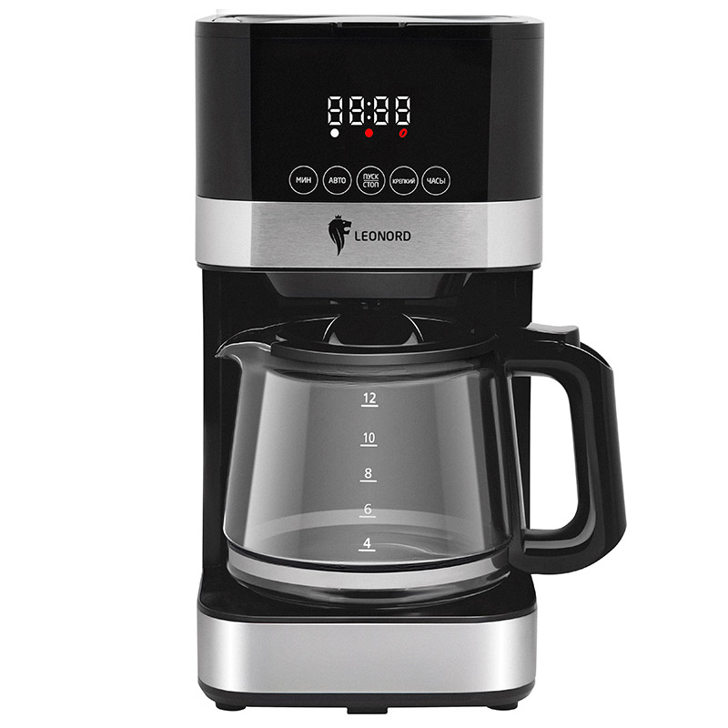 Мощность 900 Вт Объем кофейника 1,5 литра LED дисплей с сенсорной панелью управления Кофейник из термостойкого стекла Шкала уровня воды Многоразовый фильтр из нейлона Платформа с подогревом Поддержание температуры Автоотключение через 40 минут Противокапельная система Отложенный старт