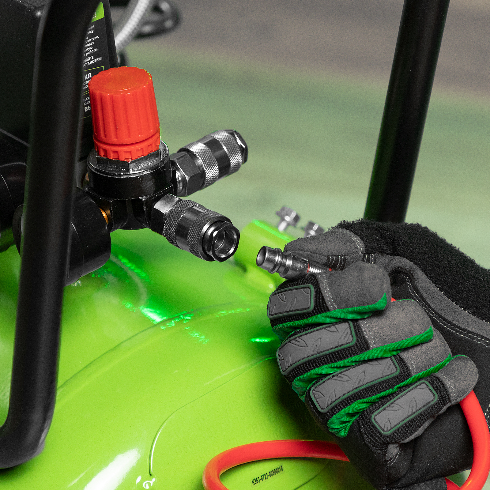 Простое подключение — выходной быстросъемный коннектор позволяет подсоединить пневмоинструмент одним движением.