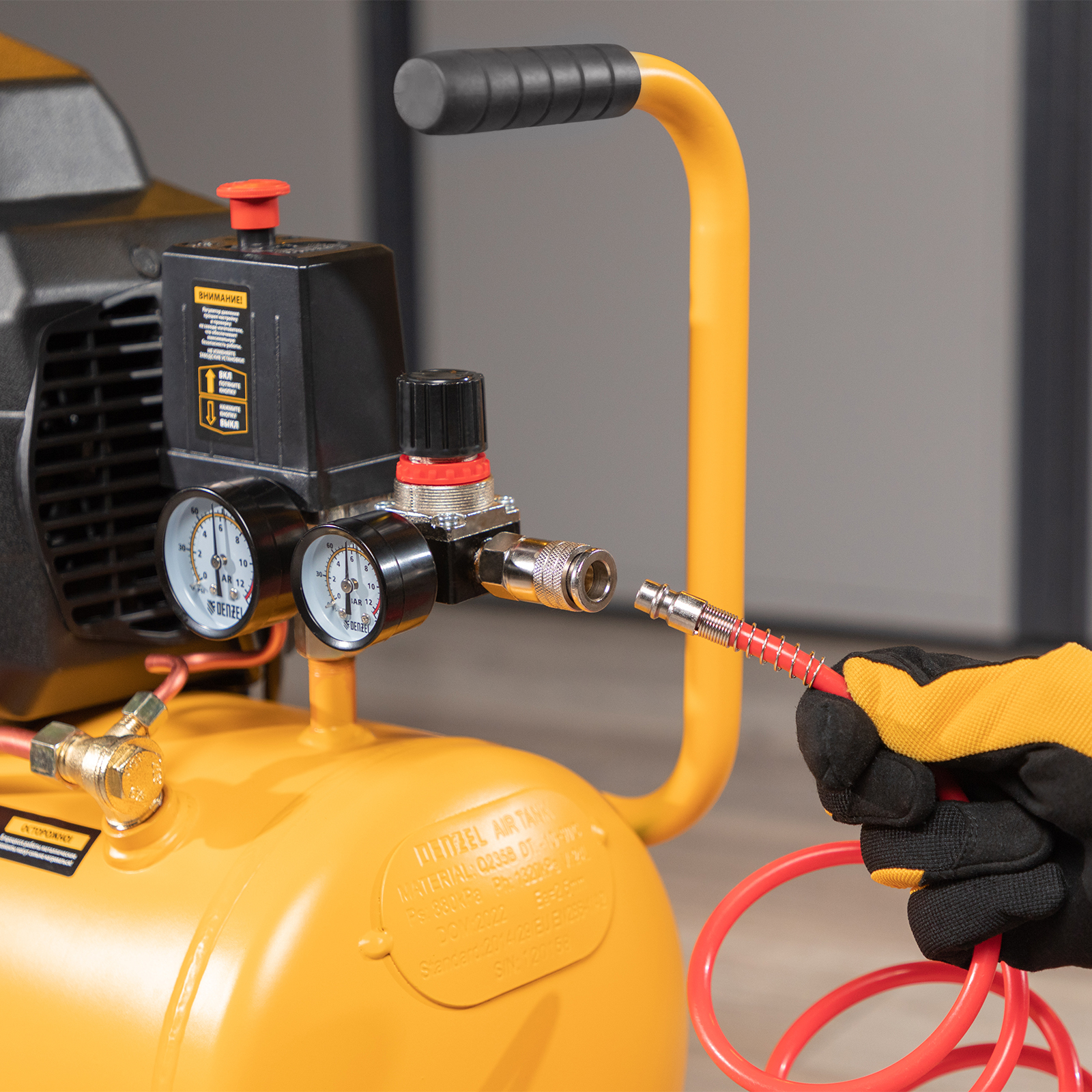 Удобный контроль рабочих параметров — 2 манометра отображают давление в ресивере и выходной магистрали.
