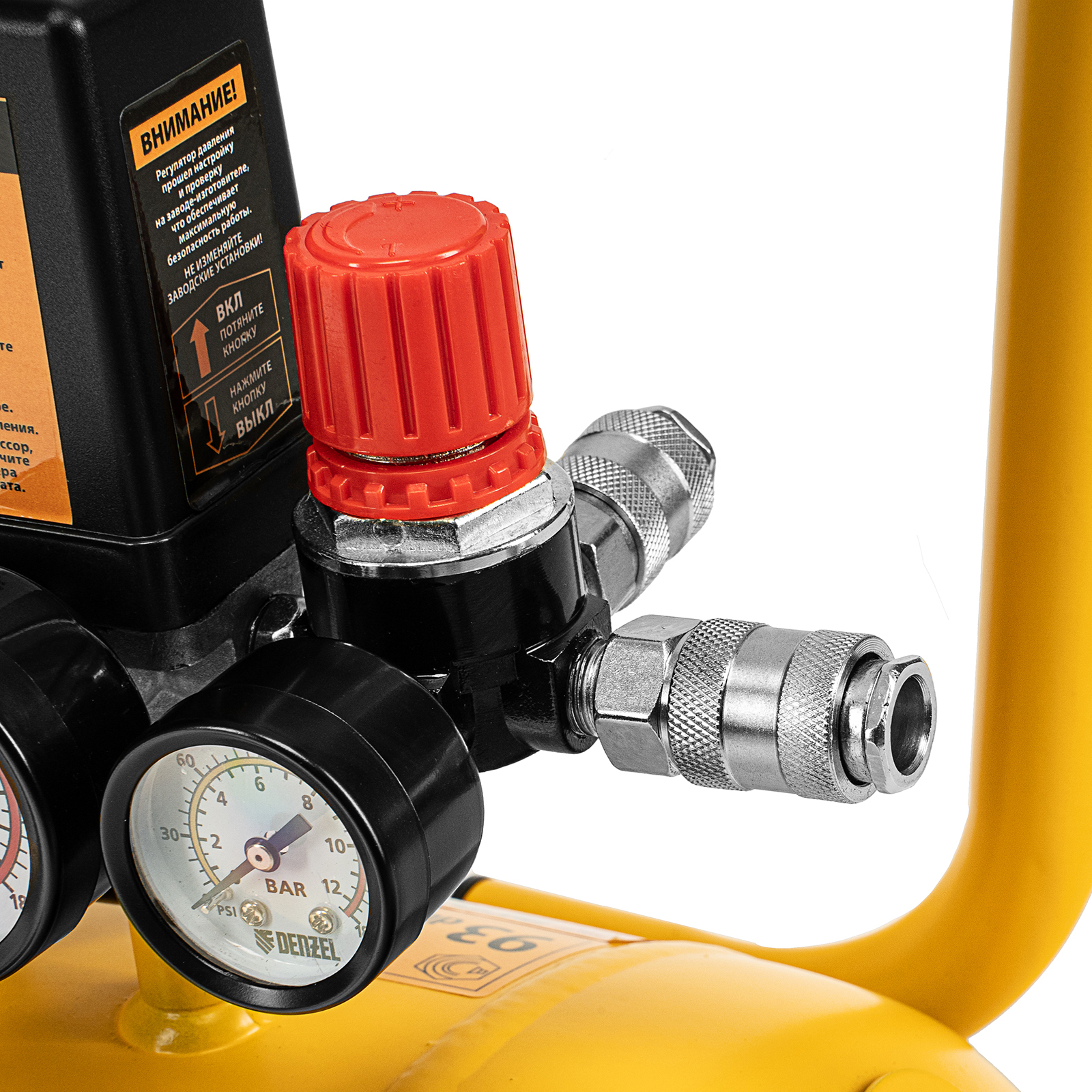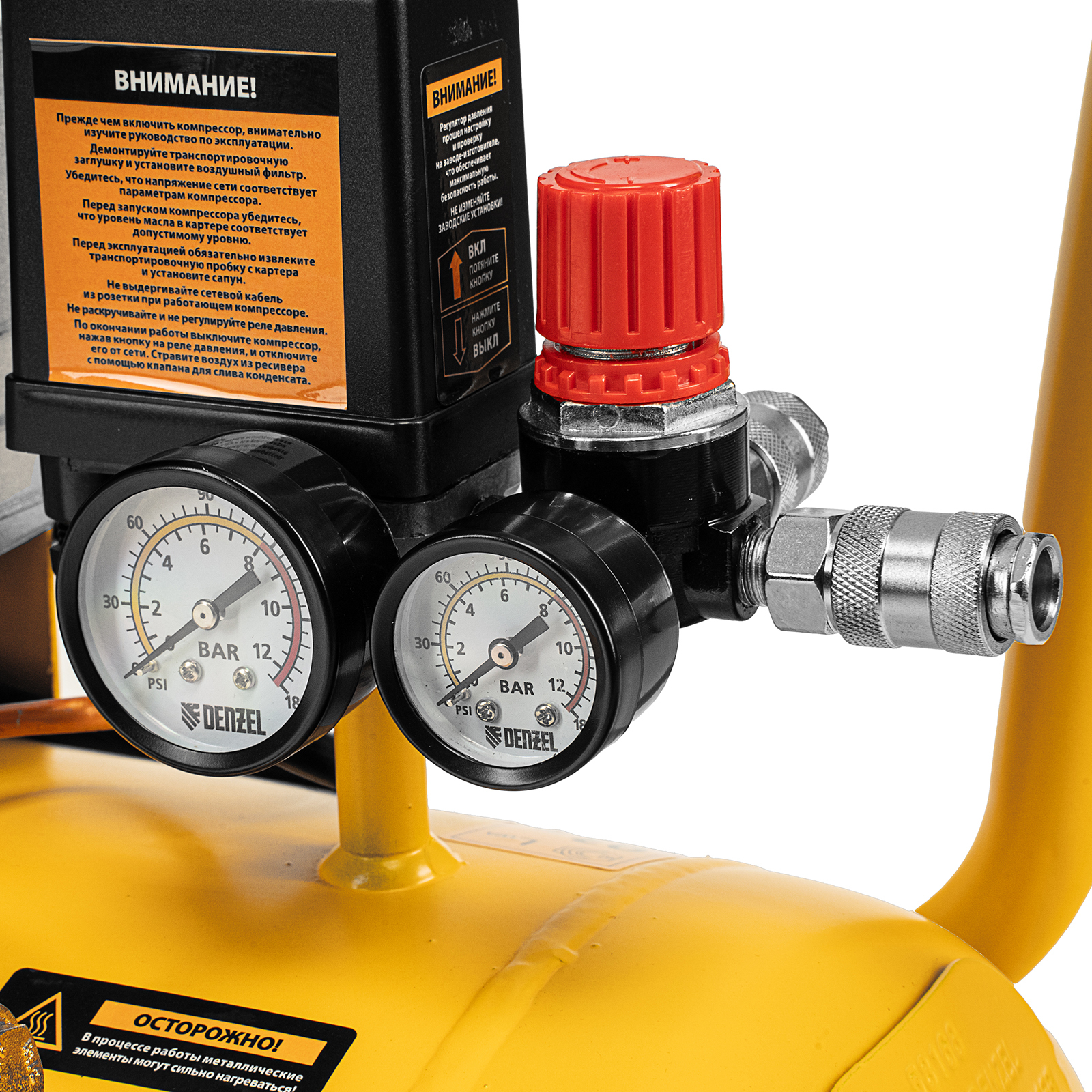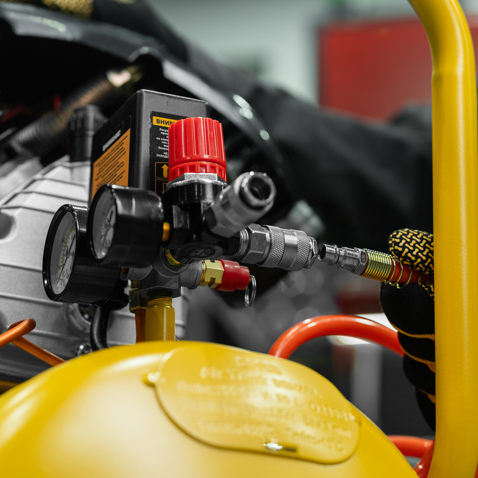 Контроль давления и расхода воздуха — компрессор оснащен регулятором и двумя манометрами.