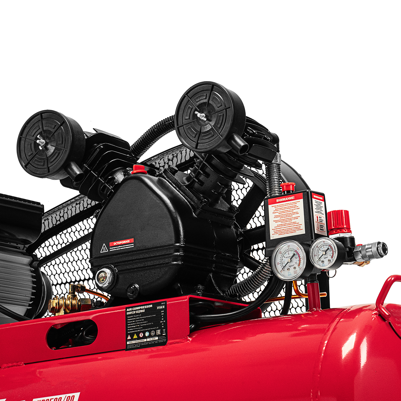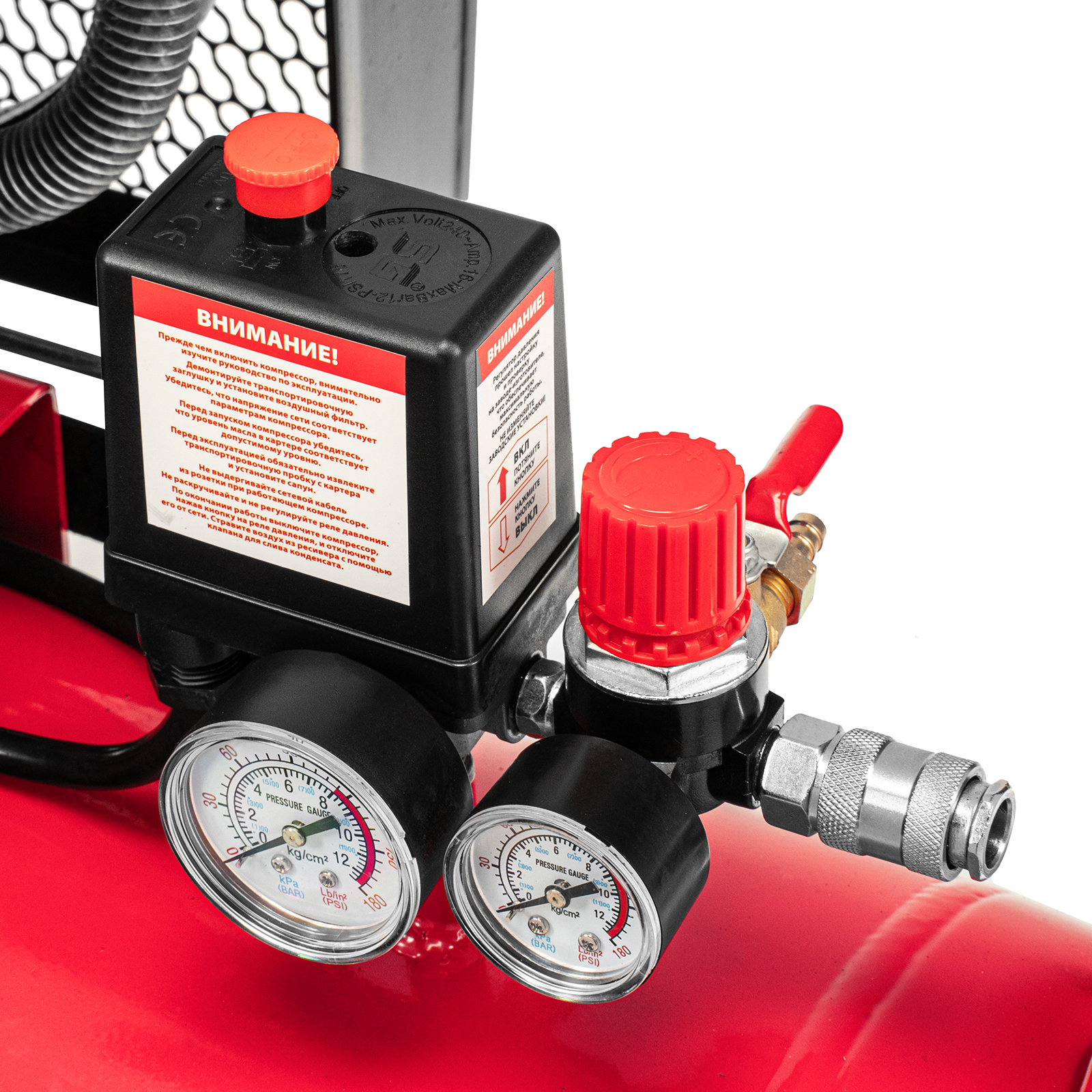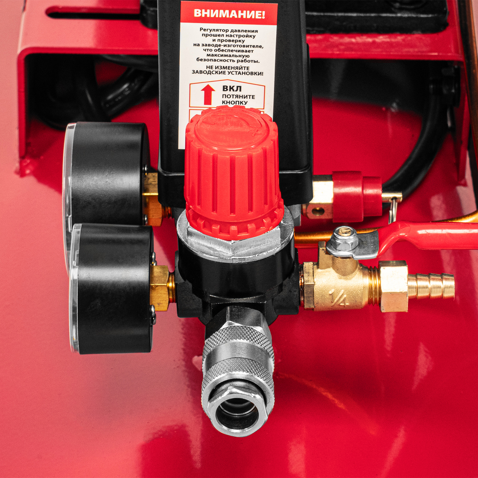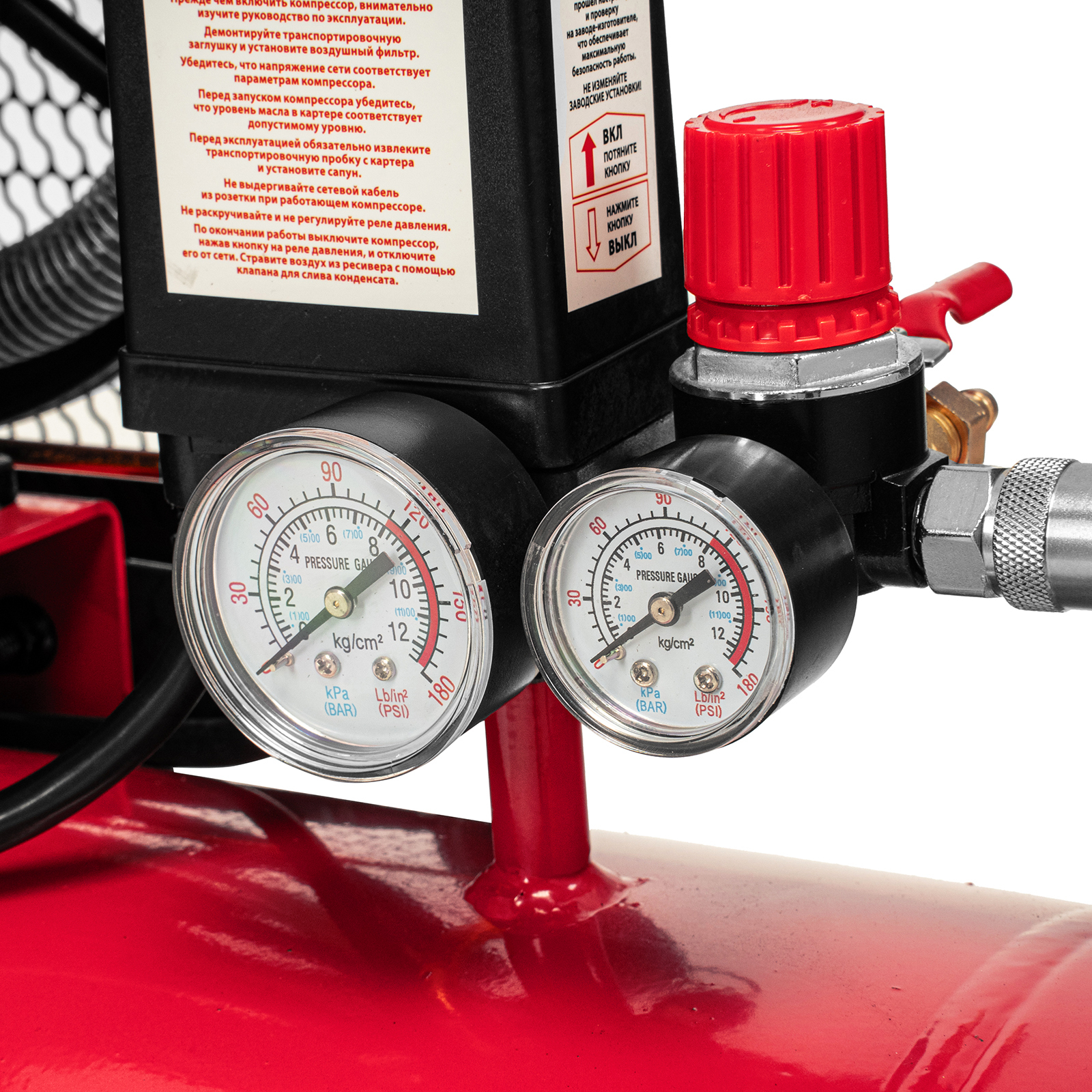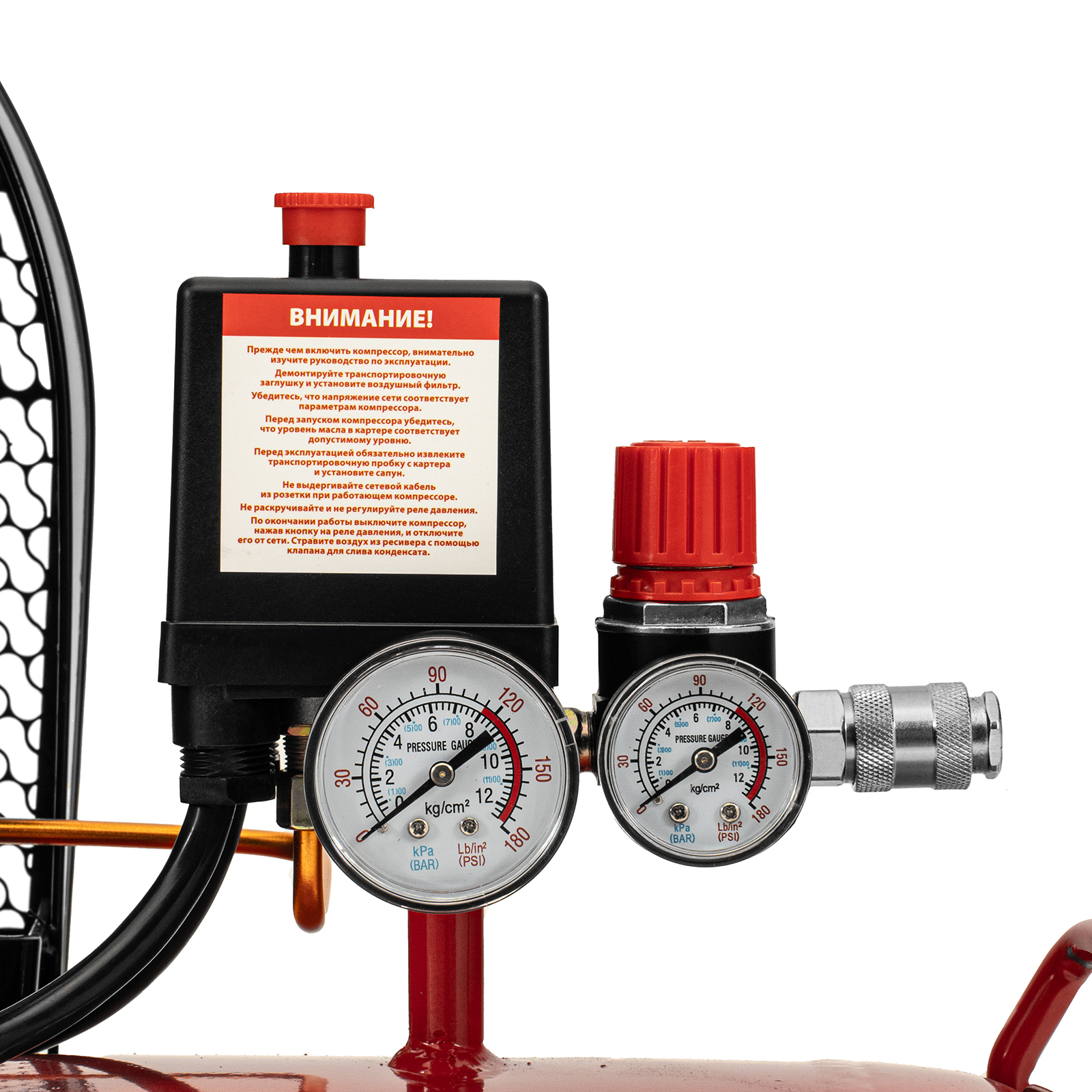 Удобный контроль давления в ресивере и пневмомагистрали — компрессор оснащен двумя механическими манометрами.
