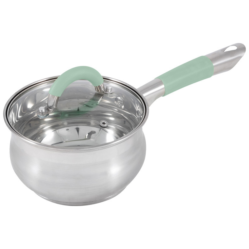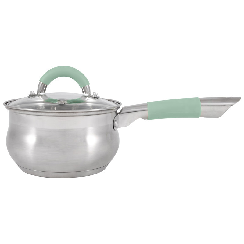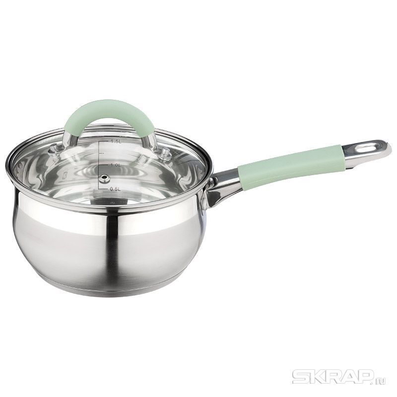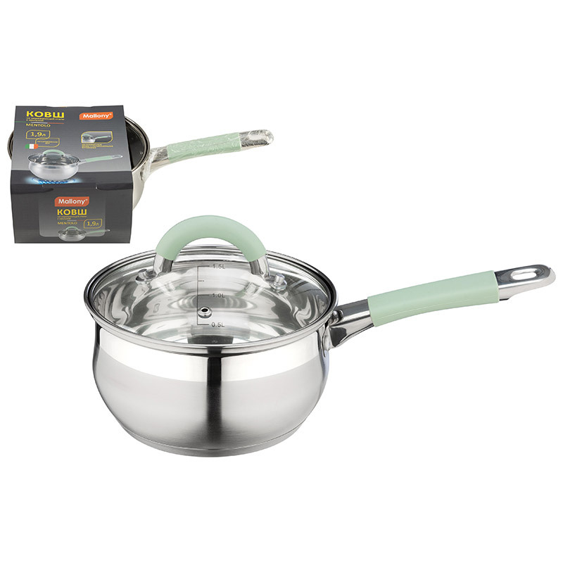 Ковш MENTOLO, 1,9 л, из нержавеющей стали с крышкой, ручки с силиконом Материал: нержавеющая сталь, жаропрочное стекло, силикон, алюминий, сталь. Толщина стенок: 0,5 мм. Силиконовое покрытие на ручках. Ручки полые из нерж стали. Дно капсулированное: сталь+1 мм алюм+сталь. Подходит для всех типов плит. Смешанная полировка внешнего корпуса, внутри - зеркальная полировка с отметками литража. Крышка из жаропрочного стекла с отверстием для выпуска пара. Размер 16*9,5 см