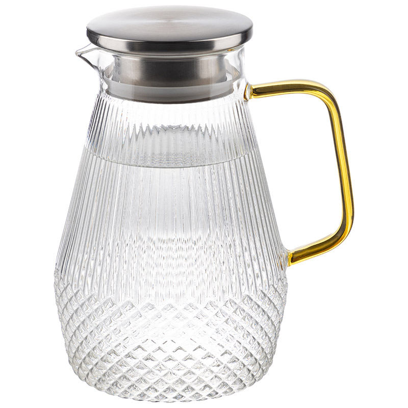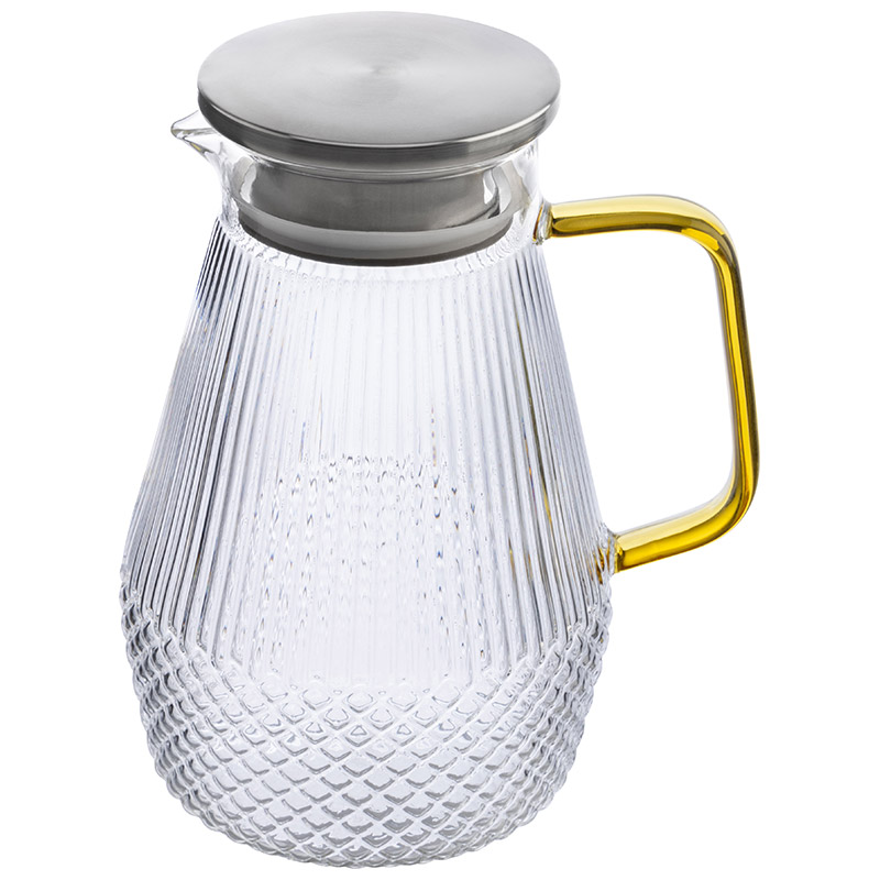 Кувшин AROMA 1,6 л из боросиликатного рельефного стекла с крышкой-фильтром из нерж стали, с ручкой из цветного стекла. Материал: термостойкое боросиликатное стекло+304 нерж сталь+силикон.