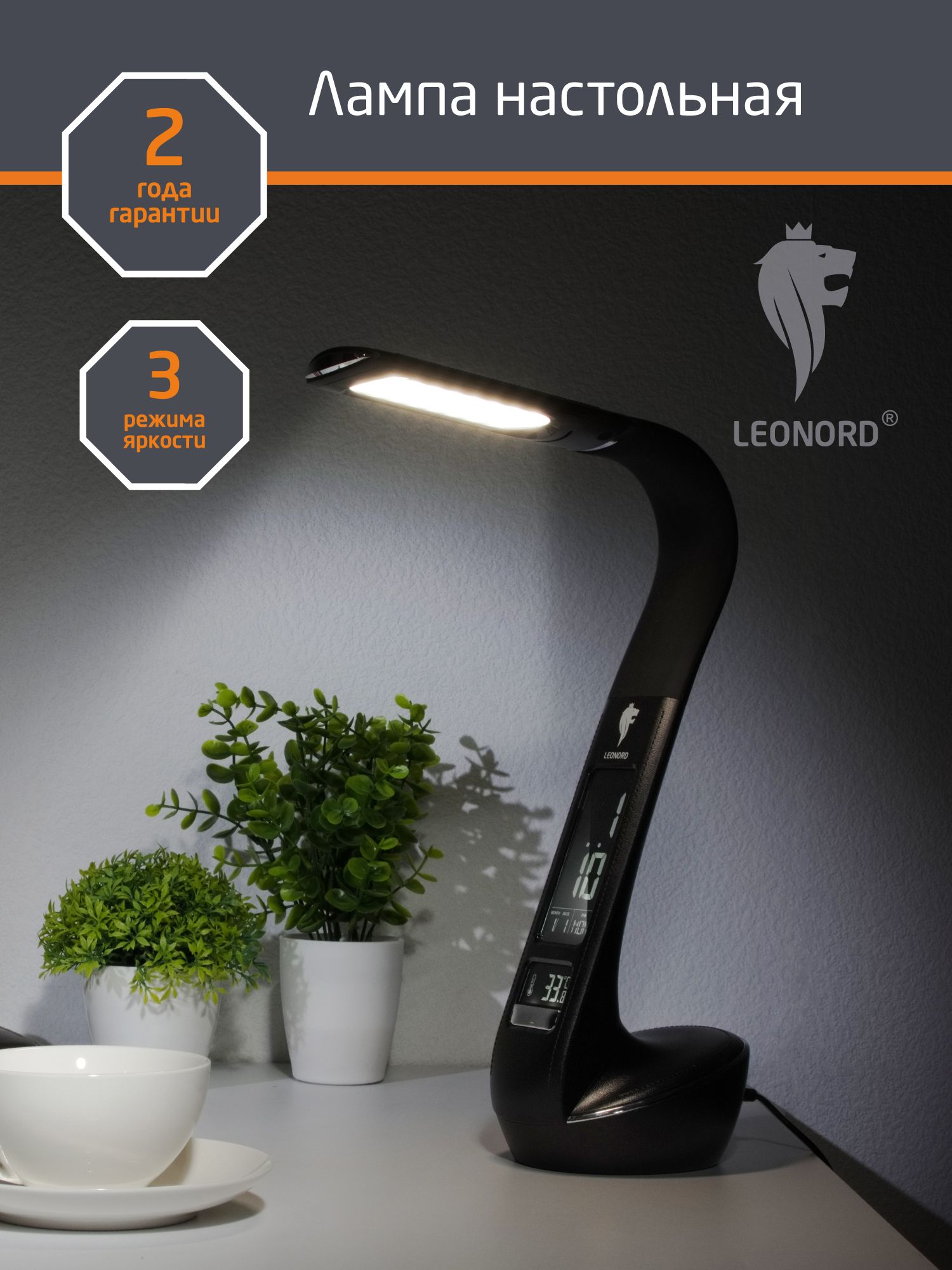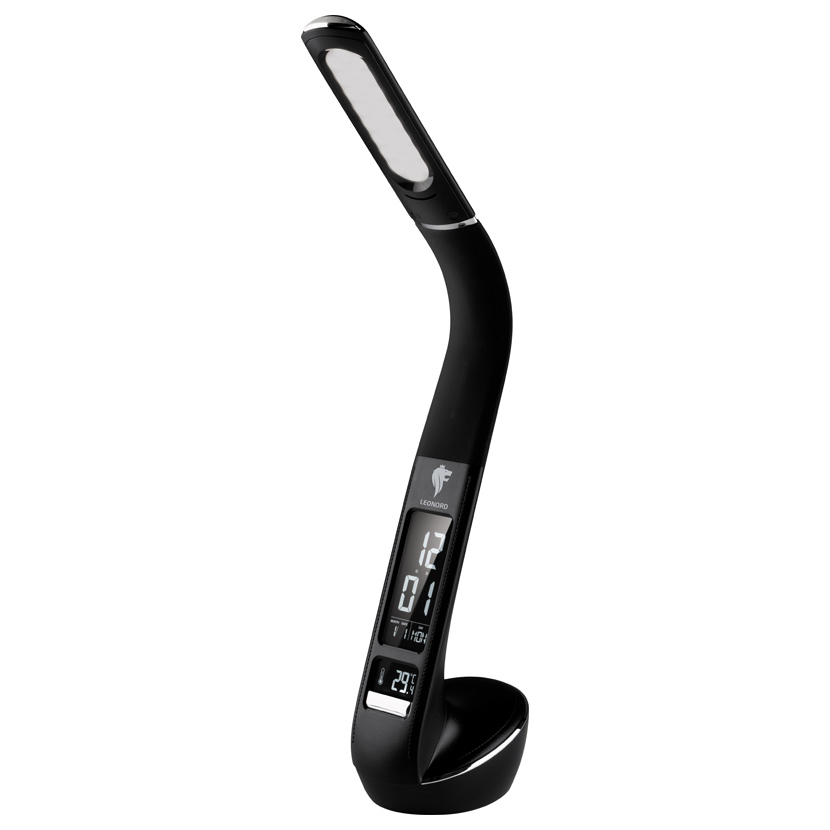 Мощность 5 Вт Многофункциональный дисплей с указанием даты/времени/температуры(работает от батарейки CR2032, входит в комплект) Будильник Плавное изменение угла наклона лампы Покрытие soft touch 25 LED ламп 3 режима яркости Световой поток 200 лм Высота лампы 45 см Адаптер в комплекте Длина шнура с адаптером 1,5м