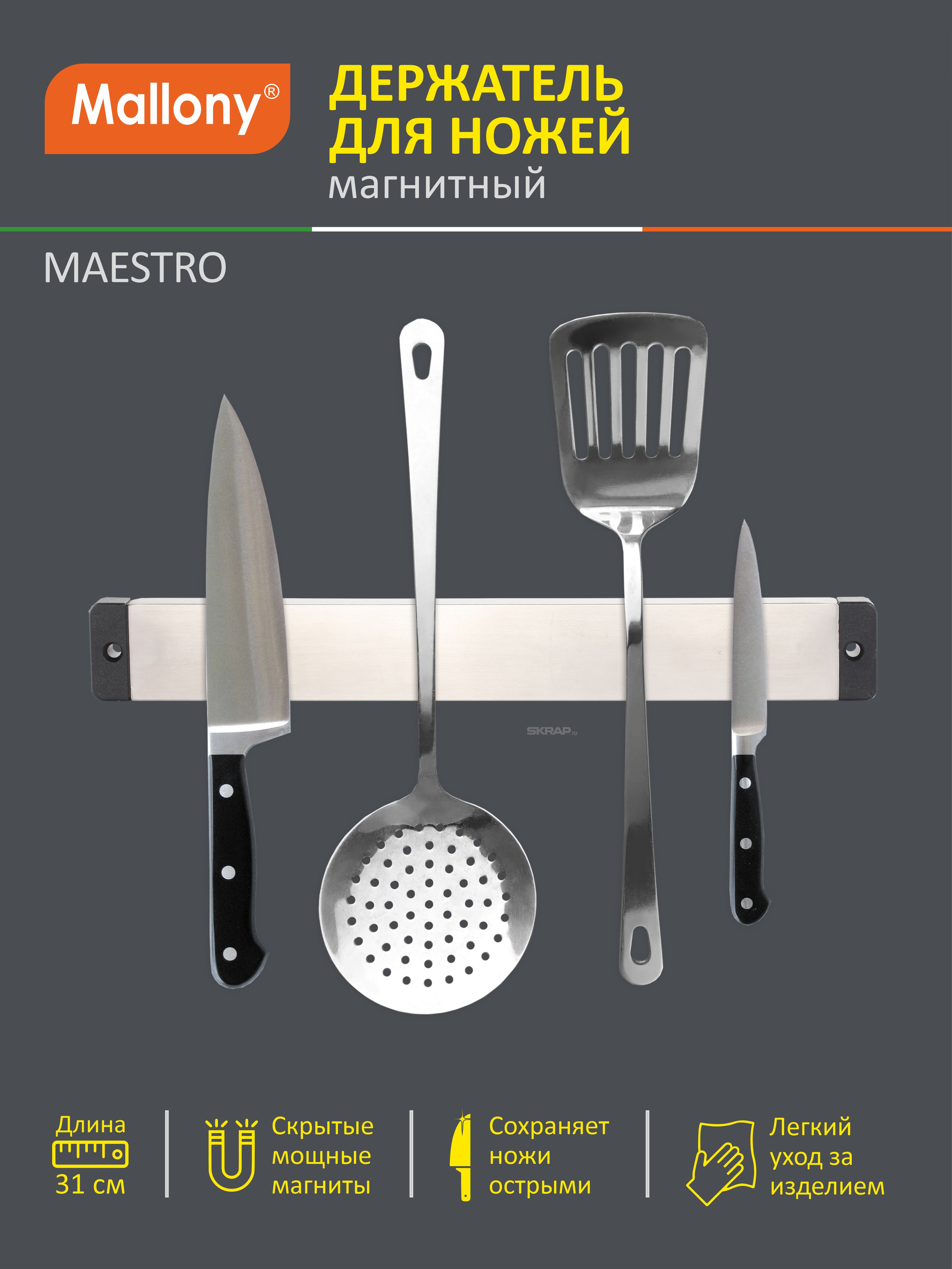 Магнитный держатель для ножей позволяет хранить ножи и другие металлические инструменты на стене, сохраняя пространство на рабочем столе. Крепление на шурупы (входят в комплект). В комплекте доп наклейки для маскировки мест крепления. Размер: 31*4*1,5 см Материал: нержавеющая сталь (201), элементы из пластмассы, магнит