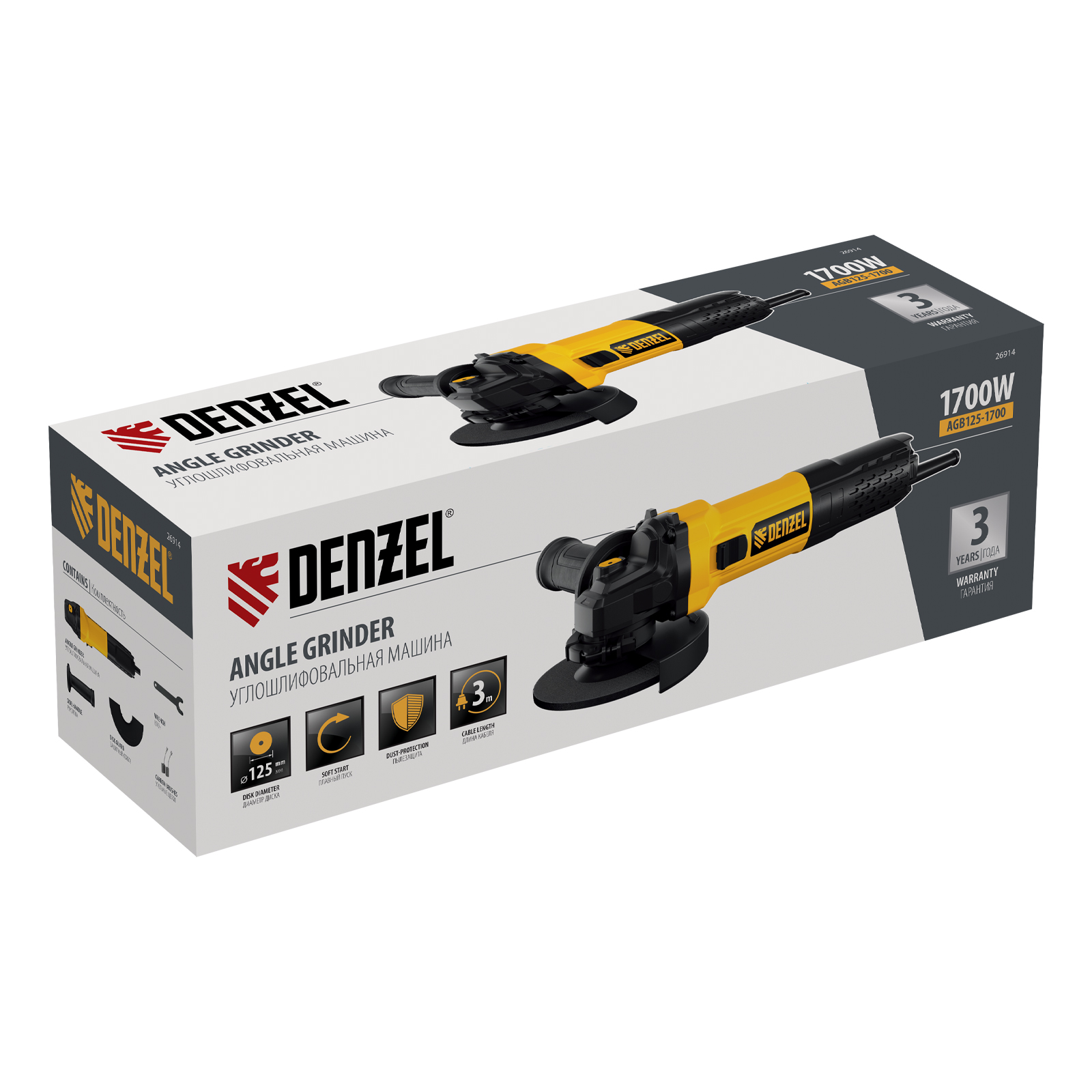 Угловая шлифовальная машина Denzel AGB-125-1700 26914 мощностью 1700 Вт используется для выполнения отрезных, зачистных и шлифовальных работ с металлическими заготовками при помощи абразивных кругов и проволочных щеток. Совместима с оснасткой диаметром 125 мм, имеет функцию поддержания оборотов под нагрузкой, частота вращения шпинделя составляет 3000-11000 об/мин. Система пылезащиты двигателя позволяет работать по бетону и камню.ПреимуществаВыбор оптимального режима — электронная регулировка позволяет устанавливать необходимую частоту вращения.Плавный пуск — машина включается без рывков, также исключается перегрузка электросети.Эффективность — опция поддержания оборотов двигателя под нагрузкой позволяет шлифовать материалы неоднородной твердости.Безопасность — производителем предусмотрена защита от случайного пуска, защита от перегрузки и двойная изоляция токопроводящих элементов.Быстрая подготовка к работе — функция блокировки шпинделя в сочетании с бесключевой регулировкой кожуха упрощает установку и замену оснастки.Фиксация кнопки пуска — во время работы не нужно постоянно удерживать выключатель.Эргономичность — тонкий корпус удобно держать в руке, боковую рукоятку можно установить слева или справа для наиболее комфортного захвата.Свободное перемещение по рабочей зоне — длина кабеля составляет 3 метра.Безопасная работа — улучшенный защитный кожух предохраняет пользователя от летящих искр и осколков.Комфортная работа — углошлифовальная машина весит всего 2,1 кг.Все необходимое в комплекте — УШМ поставляется с боковой рукояткой, защитным кожухом, ключом для фиксации оснастки и запасными угольными щетками.Гарантия 3 года — высокое качество инструмента подтверждено производителем.